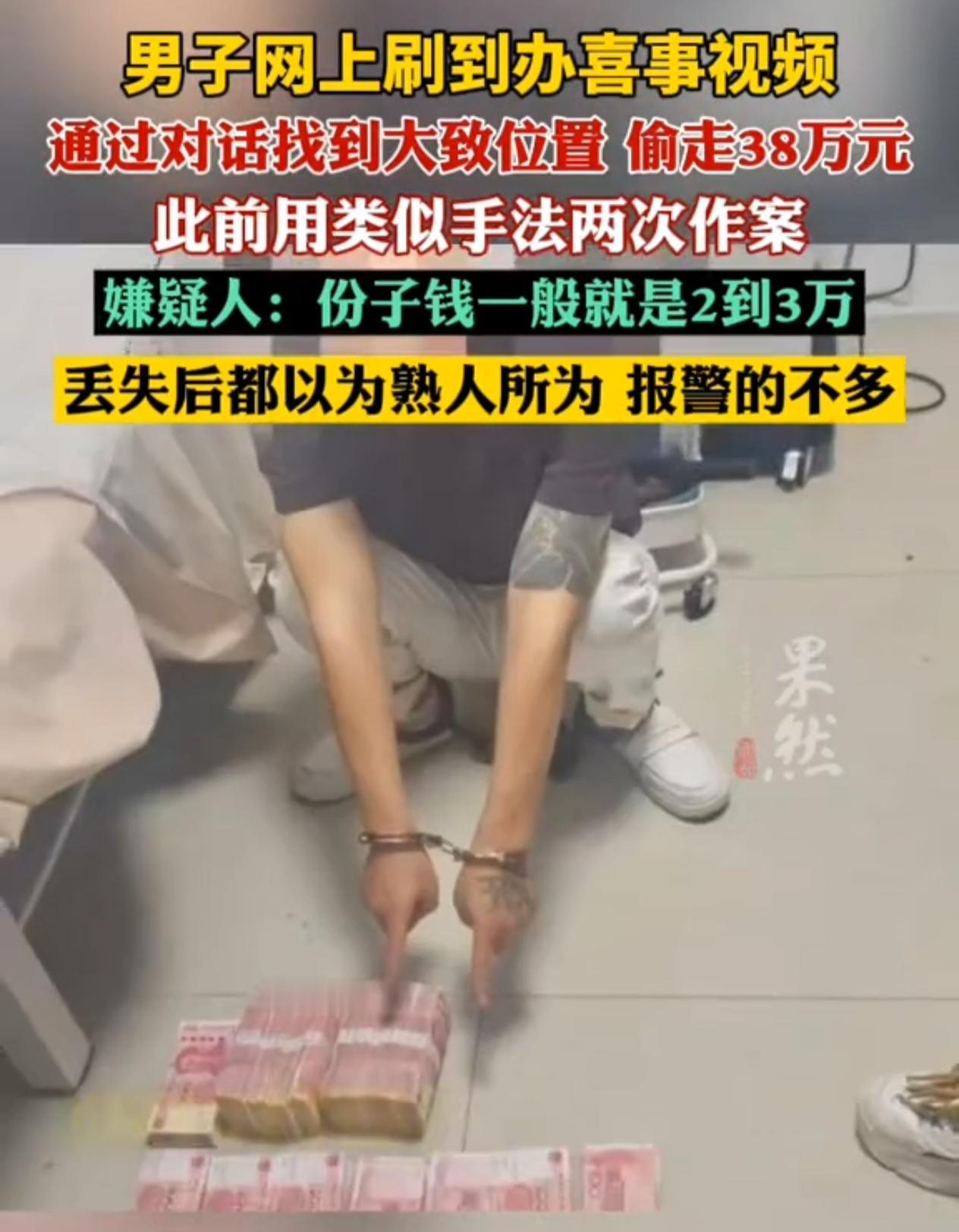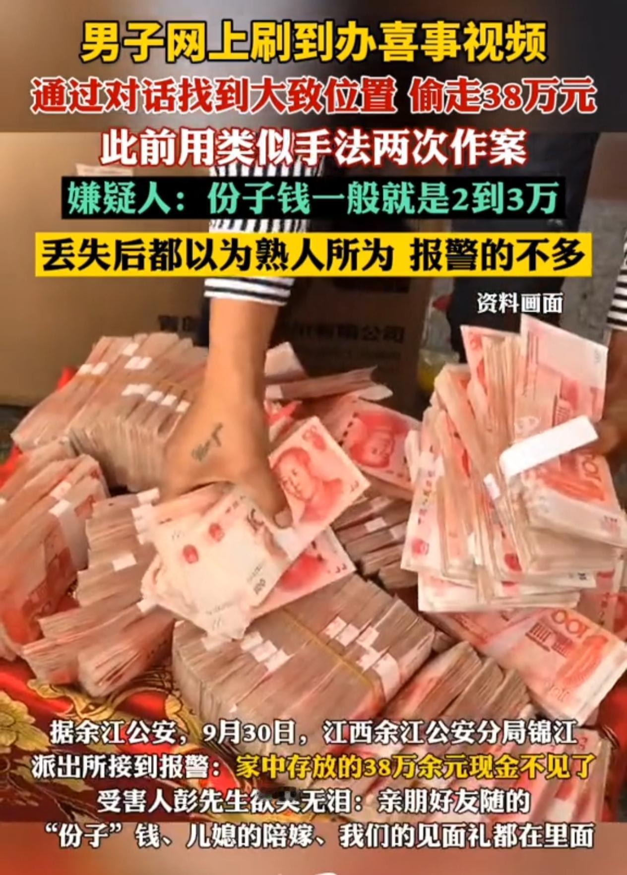“真是没想到!”江西余江,一名男子家中办喜事,高兴之余便在网上发了段视频,还晒出了38万礼金。没成想,小偷顺着网上的信息找到了地址,把钱偷走了…… 近日,江西这名男子因儿子结婚,收到了亲朋好友随的份子钱和其他现金。他没多想,就拍了视频到网上分享这份喜悦,其中还晒出了礼金。视频里,有人喊了他一声“铁山彭总”。其实,碰到喜事想晒晒本无可厚非,就像我们平时一样,但他不该把礼金也晒出来。老话说“财不外露”,确实有道理。 据公安部门的数据,每年因社交平台泄露隐私引发的盗窃案超过2万起,其中30%都和“晒财物”有关。像视频里“铁山彭总”这样的称呼,再加上场景里的细节,很容易让人锁定具体位置。 后续调查发现,小偷正是通过视频里的街道标识、房屋特征,花了两天就找到了男子家。这类有针对性的盗窃案,破案周期比普通盗窃案长40%,追回财物的难度也更大。 还有数据显示,70%的人在晒生活时,会无意间暴露住址、财物等信息,却没意识到其中的风险。比如晒礼金时,背景里的门牌号、小区名,都可能成为别人找上门的“线索”。 网上分享要守住隐私底线,“财不外露”不只是句老话,更是对自己的保护。开心的事可以晒,但涉及财物、个人信息的内容,得多留个心眼,别让喜事最后变成了糟心事。