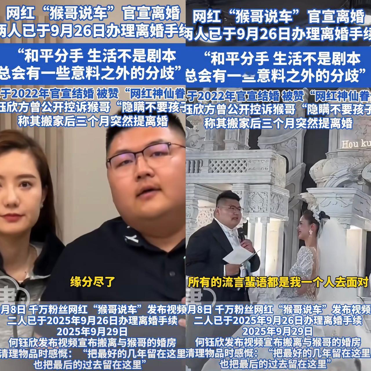 猴哥离了, 不是因为破产, 也不是因为财产,而是 这五年感情里积攒的矛盾给闹的。 五年前,他俩在南京一家小面馆拍了第一条视频,开启了一段旅程;五年后,又回到同一家面馆吃散伙饭,点的还是原来那碗面,一切似乎又回到了原点,给这段感情画上了句号。 猴哥自己也承认,离婚问题出在自己身上,一是以前太幼稚,没能扛起家庭的重担,二是工作太忙,疏忽了对妻子的陪伴。何钰欣红着眼,却也坦然,说结婚是为了幸福,离婚也是,财产啥的都分清楚了,没扯皮。 虽说五年感情就这么一碗面收尾,怪可惜的,但能把话摊开,体面分开,总比互相瞒着、耗着强多了吧?大家怎么看他俩这事呢?