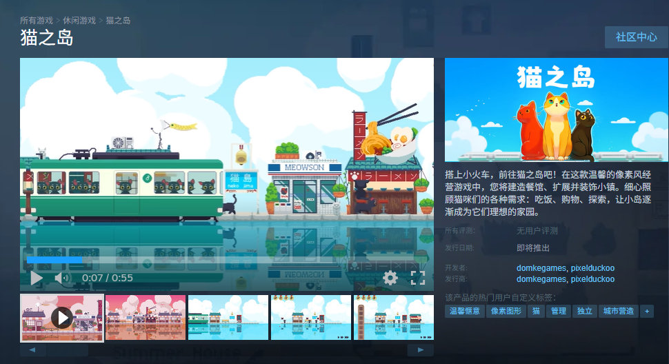 像素风经营游戏《猫之岛》Steam商店页面已上线,将于11月推出试玩版,正式发售日期待定,支持中文。玩家将从海中央的一座小小火车站岛屿开始,逐步扩建,把它打造成热闹的猫咪小镇。作为小岛的管理员,你需要洞察猫咪们的需求,精心平衡商店的供给,满足每只猫的心愿。 Steam游戏推荐