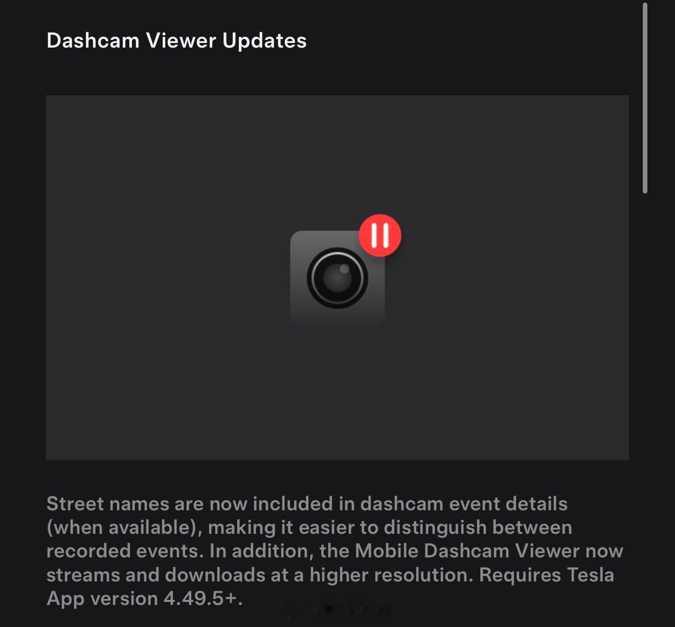 事件录像详情中新增街道名称显示(数据可用时),便于区分记录事件。此外,移动端行车记录仪查看器现支持更高清度的流媒体播放与下载。