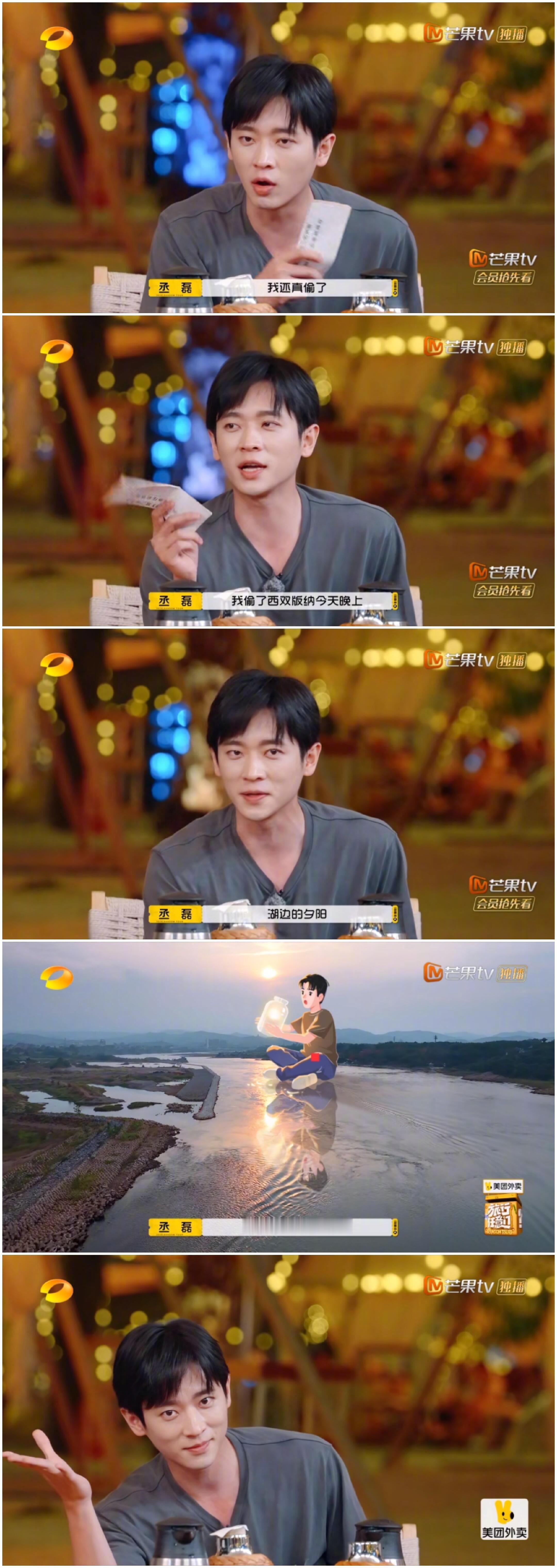 而杨迪开玩笑问他“你偷了什么”,他接住梗回答:“我还真偷了。我偷了西双版纳今天晚上湖边的夕阳,它永远存在我的记忆里。”一个“偷”字,被他用得浪漫又诗意,瞬间把即兴对话升华为诗一样的表达。