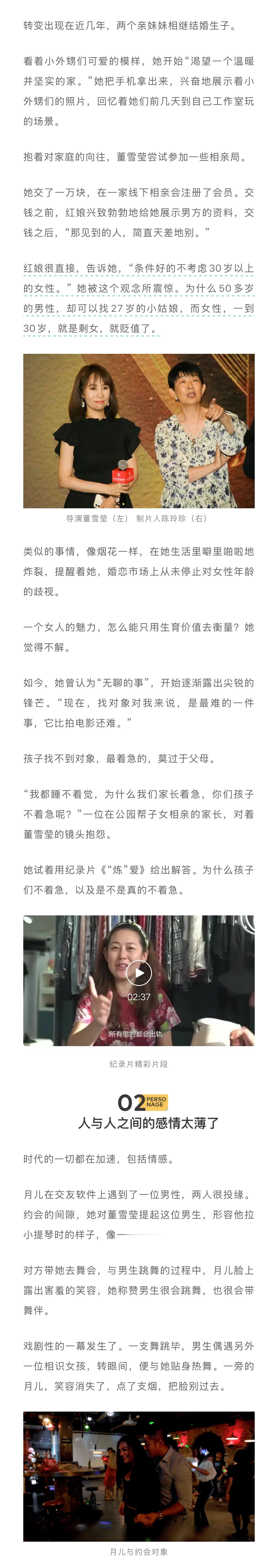2021年播出的纪录片《“炼”爱》记录了5位不同的单身女性,她们的相亲实录和多元的婚恋观。