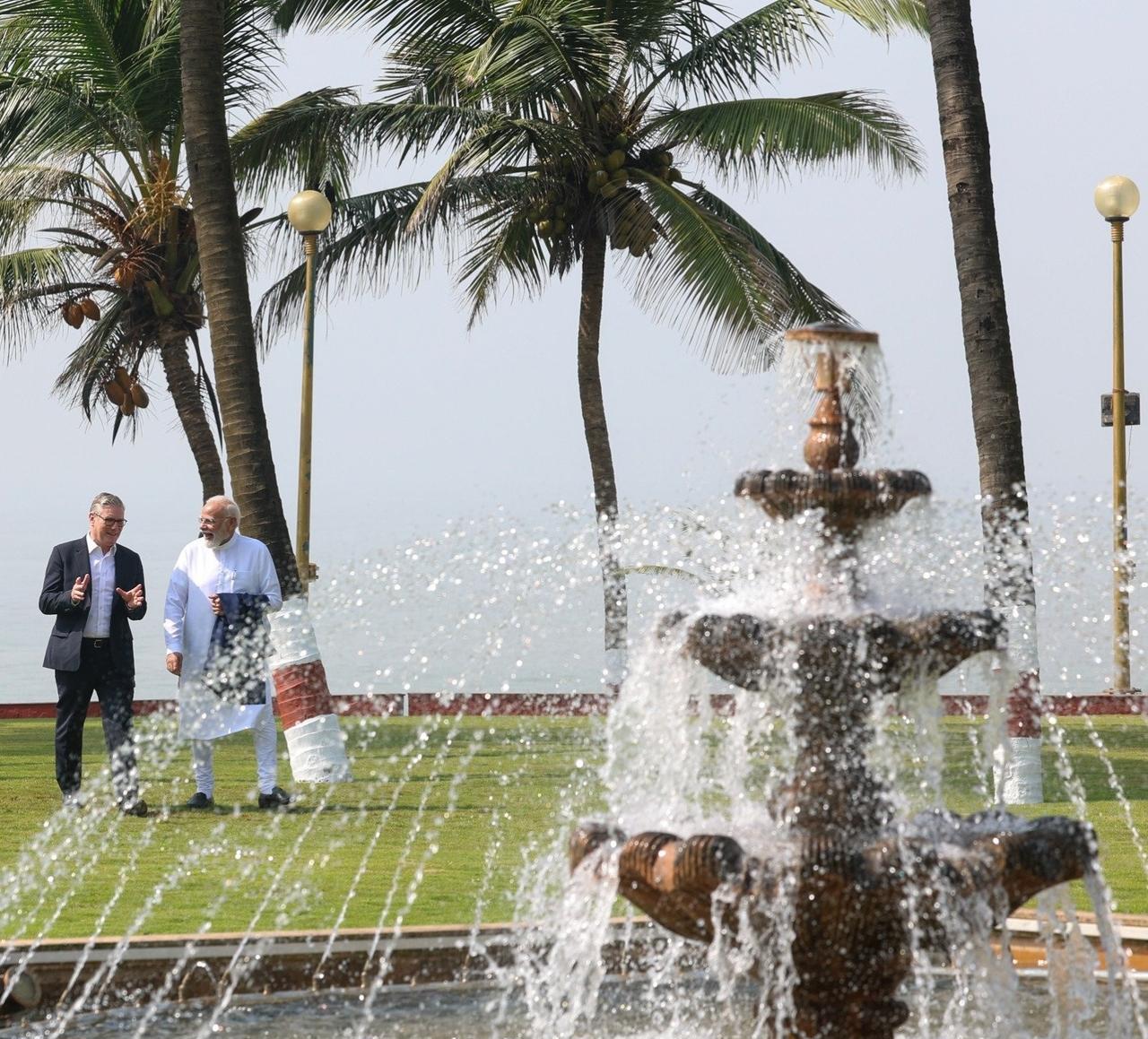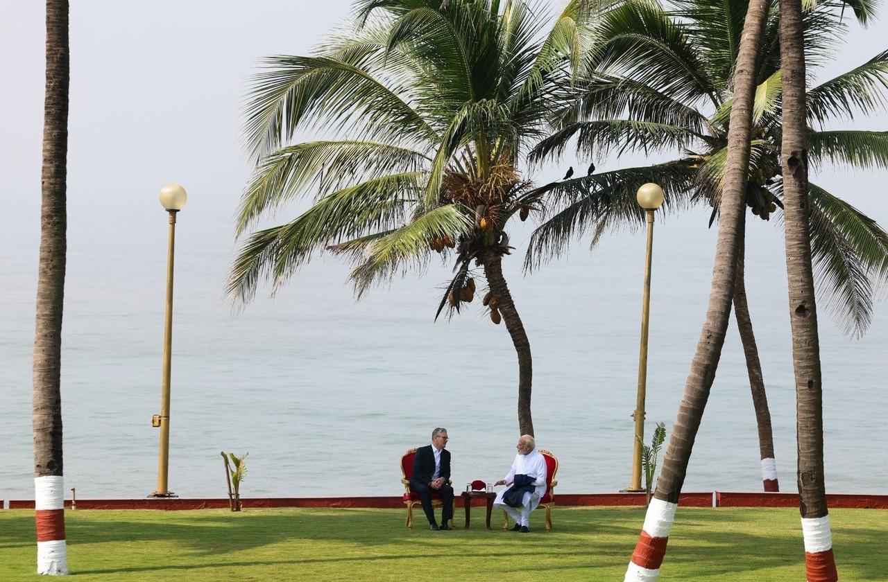背朝大海,商讨买卖。印度总理莫迪在马哈拉施特拉邦首席部长官邸会见英国首相斯塔默,该官邸位于孟买马拉巴尔山的顶端,三面环海,风景秀丽。 莫迪脱了外套,斯塔默解了领带,两人背朝大海,洽谈合作。这次斯塔默带了一个庞大的商业代表团,想和印度加强经济合作。