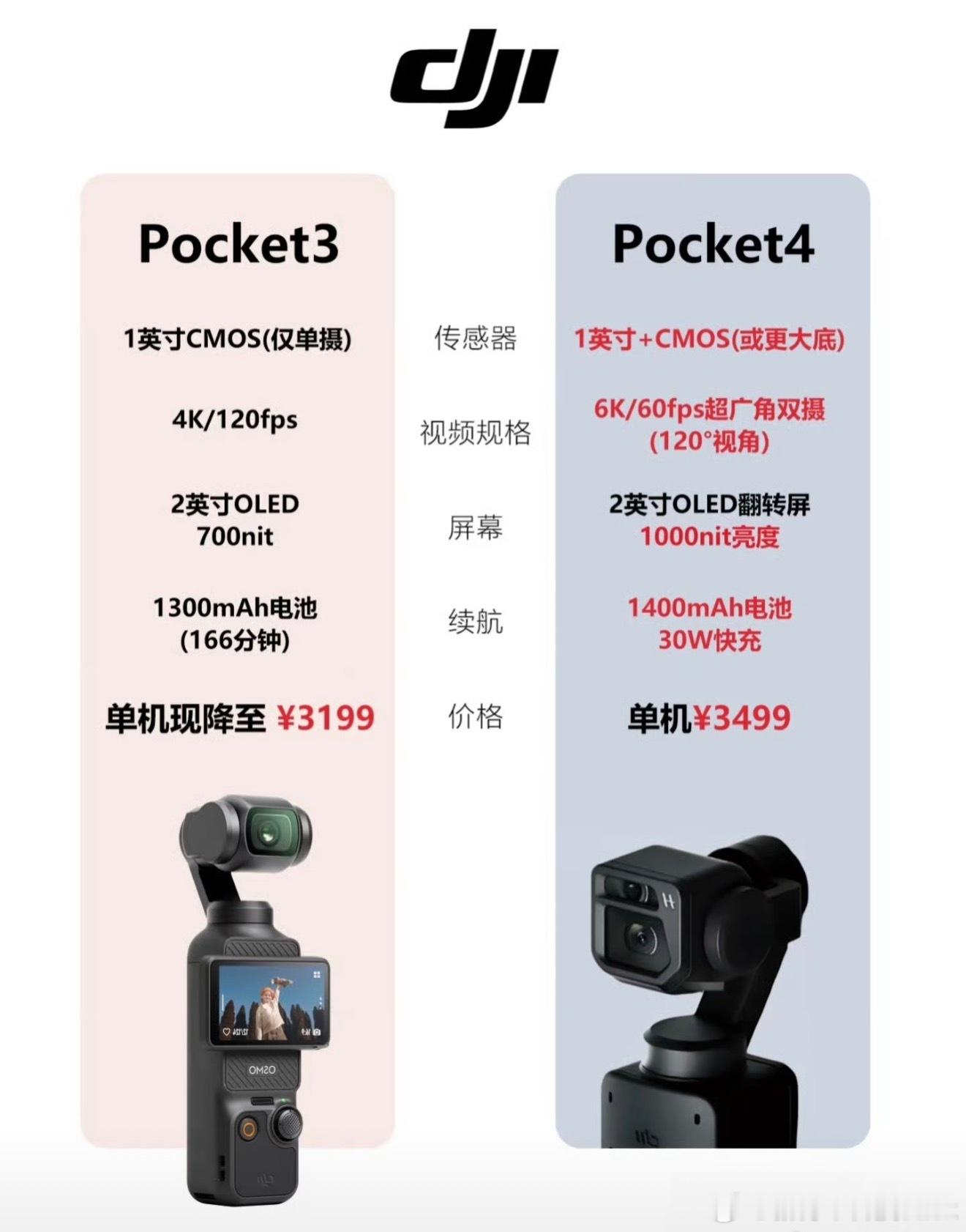 新款大疆 Pocket 4 马上来了,没必要买打折降价的 Pocket 3 吧[允悲]如果不是真的马上要出门旅行很急用,真可以等一个月吧,主要差价也就几百块,提升还是不小的。另外明年有手机厂商也要出类似的口袋相机,价格估计会便宜,功能联动也会更好大疆