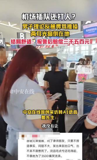 “大快人心!”10月9日,江苏南京,一男子在机场排队时遇到一家人插队,他上前理论却被插队车辱骂推搡,其中一名女子甚至两耳光将男子扇倒在地,男子选择报警,结局令人极其舒适,网友:人教人教不会,事教人一遍就会! 生活中总能遇到插队的人,这些人没有公德心,为了自己的一时便利耽误别人的时间,如果有人上提醒,插队者往往会理直气壮地反驳,甚至直接动手。 一男子在机场排队登机时一家四口忽然插到了他前面,男子看不惯这种插队的行为,大家都很着急凭什么他们能破坏秩序,于是男子没让。 谁知,一家人中稍微年长些的男性直接用箱子故意撞击男子,男子与其理论,反遭这一家人辱骂,言语极其恶毒,四个人围住男子就开始推搡,其中一名身材较胖的女性竟然直接两巴掌将男子扇倒在地。 面对这一家人的暴力行为,男子选择了报警,经过警察的协商后,这家人赔偿了男子3500元,也算是为自己的为买了单。 不少网友称赞男子的勇敢,这种人必须整治,如果放任不管,只会越来越嚣张,这3500元应该也能这家人记住,为所欲为必将收到惩罚! 信息来源:《机场插队还打人?男子理论反被辱骂推搡,两耳光扇倒在地,结局舒适》中安在线