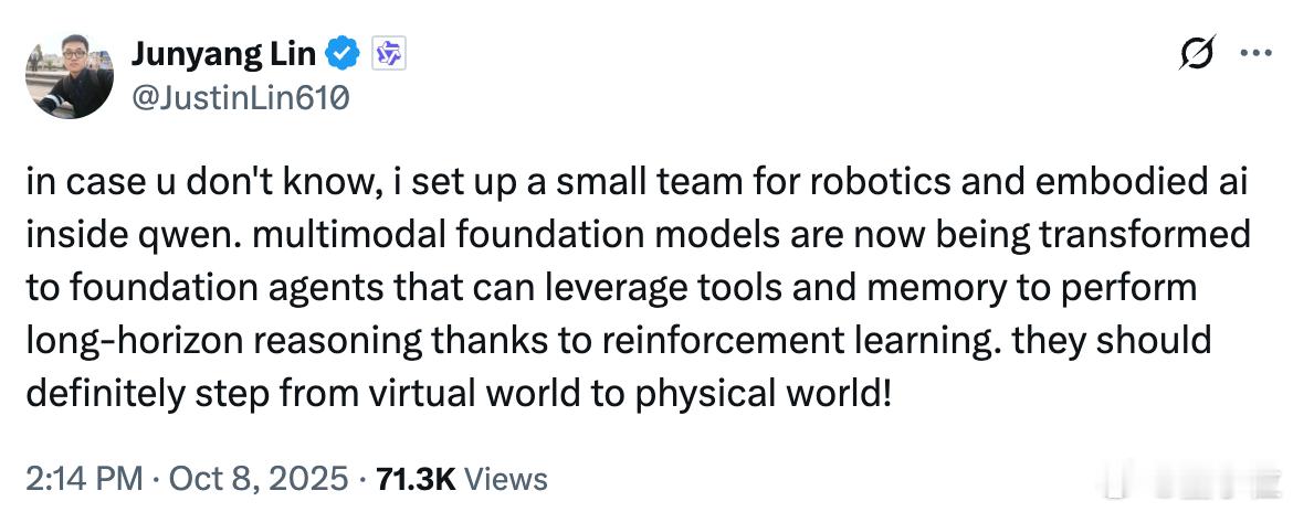 如果说以往的大模型是在"理解"世界,那具身智能的目标,就是让模型能够"参与"世界——从林俊旸的推文里不难看出,Qwen已经开始着手把多模态模型推向具身智能的新阶段。