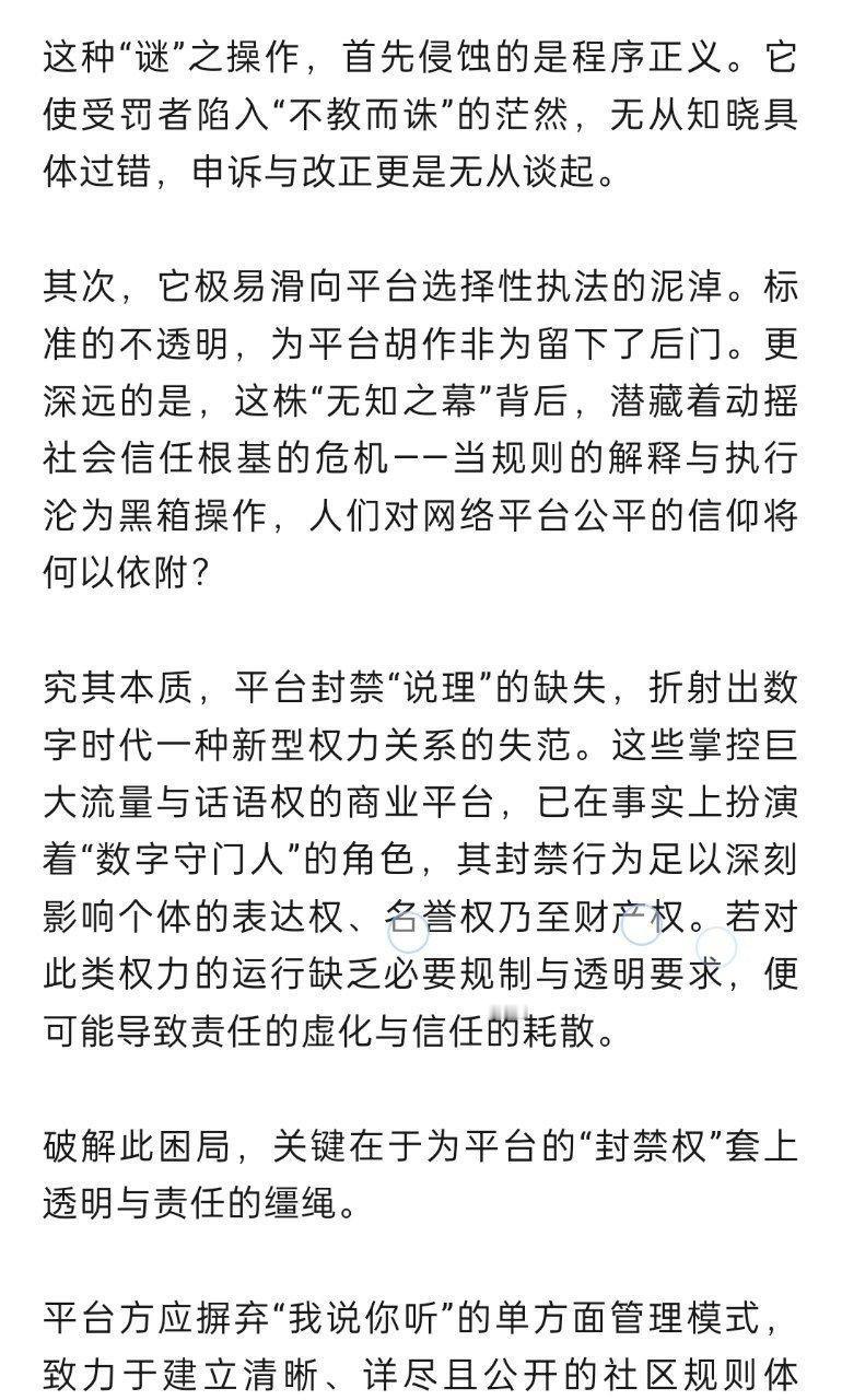 近日,山东省委机关报《大众日报》旗下公众号“捞舆工作室”发文指出,户晨风、张雪峰、蓝战非 等多位拥有千万粉丝的网红近期被平台封号或限制关注,公众对封号理由往往只能“猜谜”,平台对用户违规的依据、处罚标准及救济渠道语焉不详,仅以“违反法律法规”等模糊措辞搪塞。网红账号往往是公司核心资产,关乎众多员工生计,但平台处置程序却缺乏透明度。引起国内舆论热议,截止目前该文章已被删除。