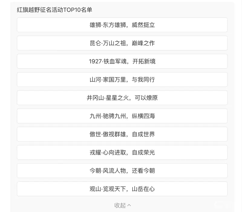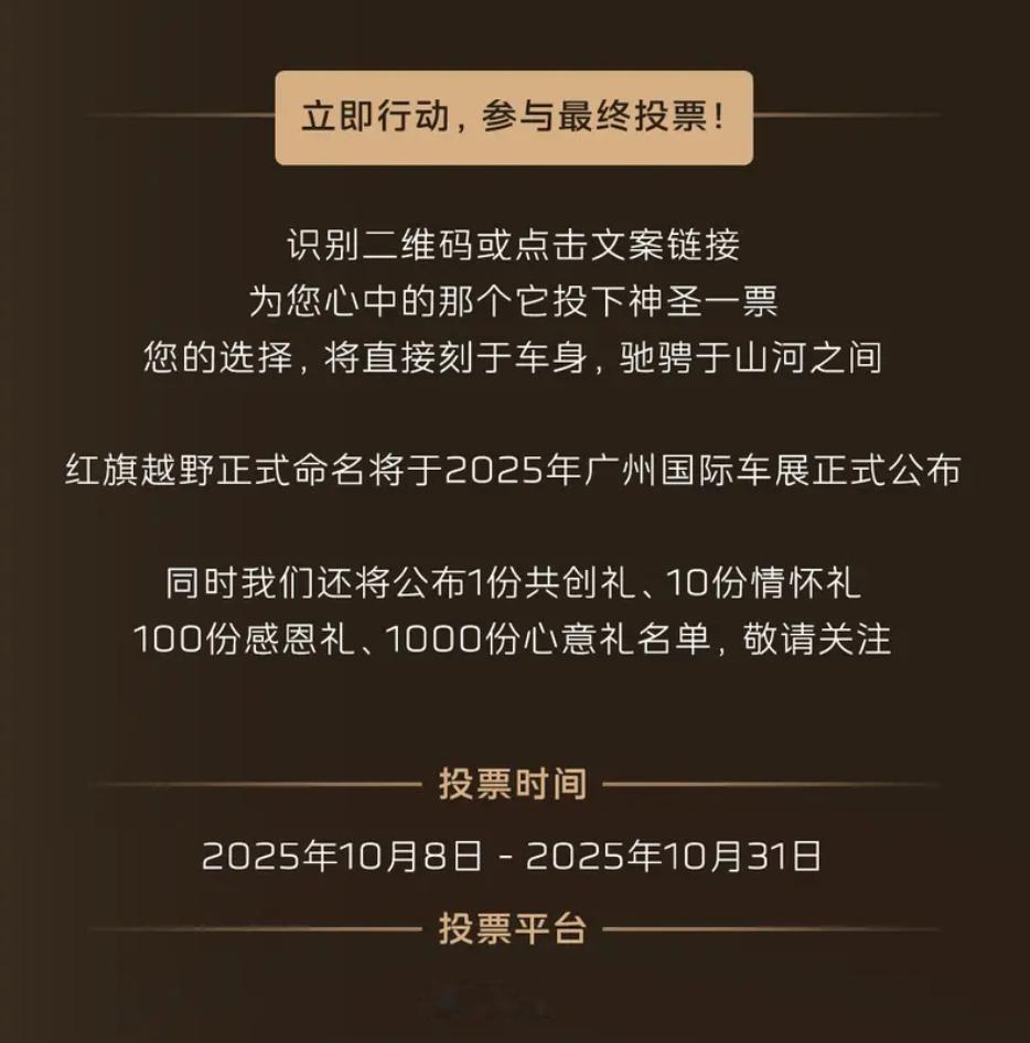 车若初见[超话] 一汽红旗的新硬派越野征名活动,现在到了新阶段,6万多组命名方案最终筛选到10个,又是驰骋九州,又是星星之火的,大家的脑洞还真是打开了,整个10月都可以投票,结果广州车展揭晓。要让咱投票,就选“家国万里”,最搭红旗的品牌调性!