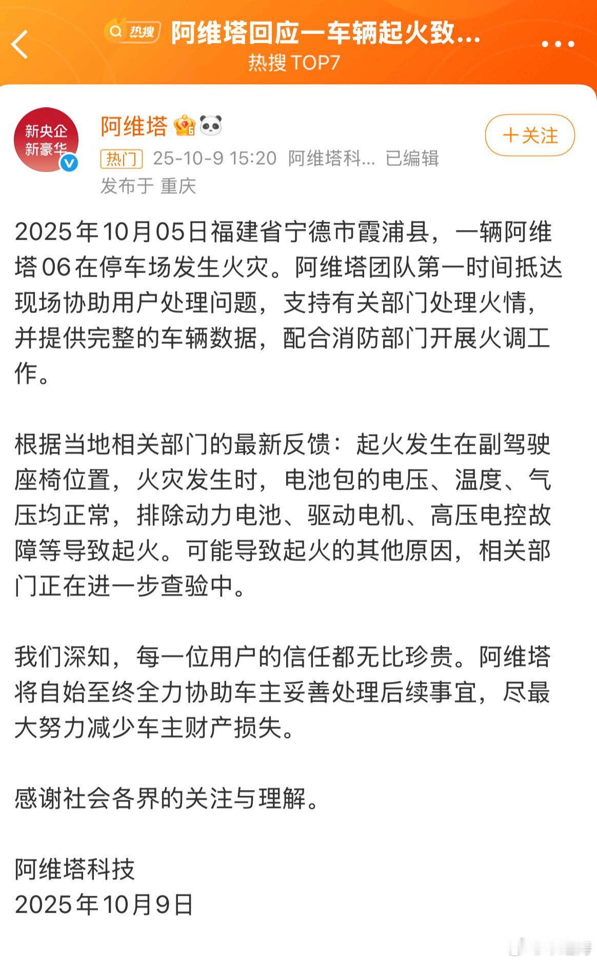 阿维塔回应一车辆起火致7车烧毁作为阿维塔车主必须来说说,网上带节奏的都不要信。