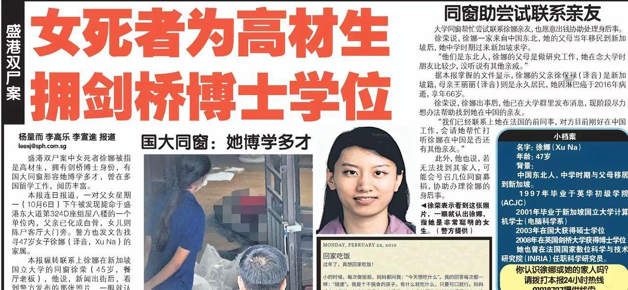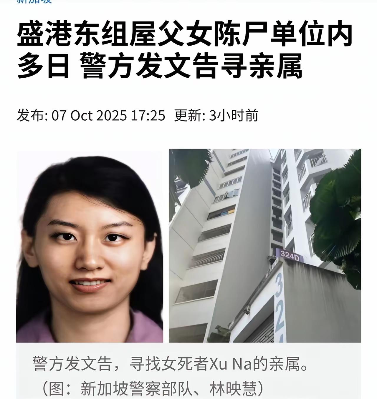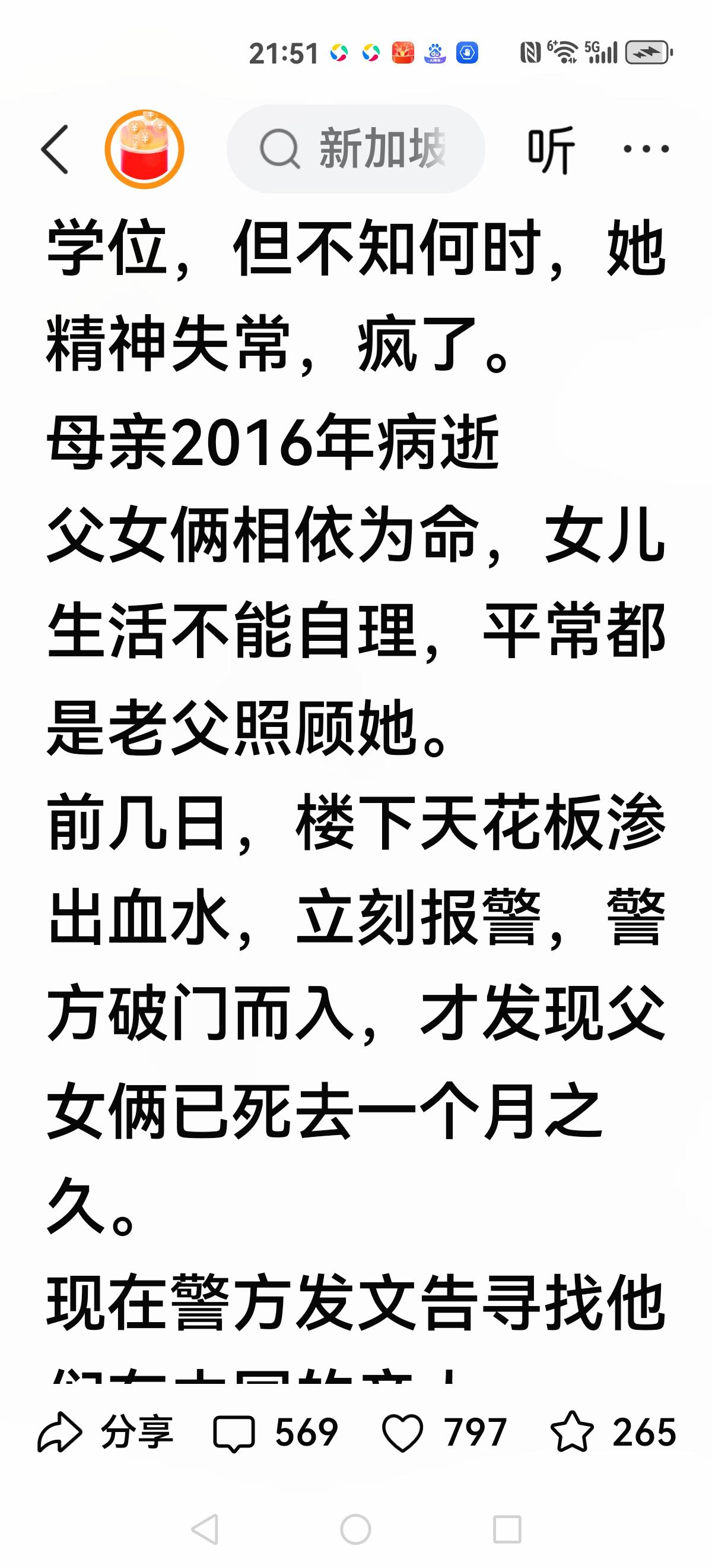 【来自新加坡的悲剧】 新加坡 不久前楼下住户发现天花板渗出血水,立刻报警。 警察对于楼上住户破门而入,发现一对父女早已身亡。 原来,这套组屋住着一家三口,来自东北。 父母是高级工程师 带着女儿移民新加坡。 女儿很优秀,剑桥博士毕业。 不知为何后来竟然疯了 母亲在2016年因病去世 从那时起,父亲照顾女儿,至今谁能想到如此结局。