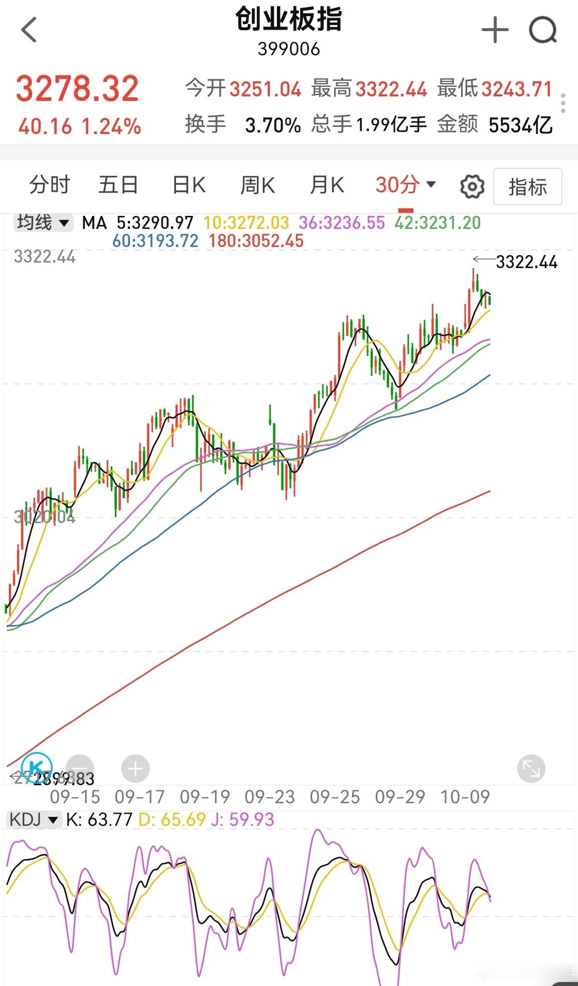 创业板半小时kdj走向死叉,尾盘能够拉升,明天早上还有冲高,然后下来。