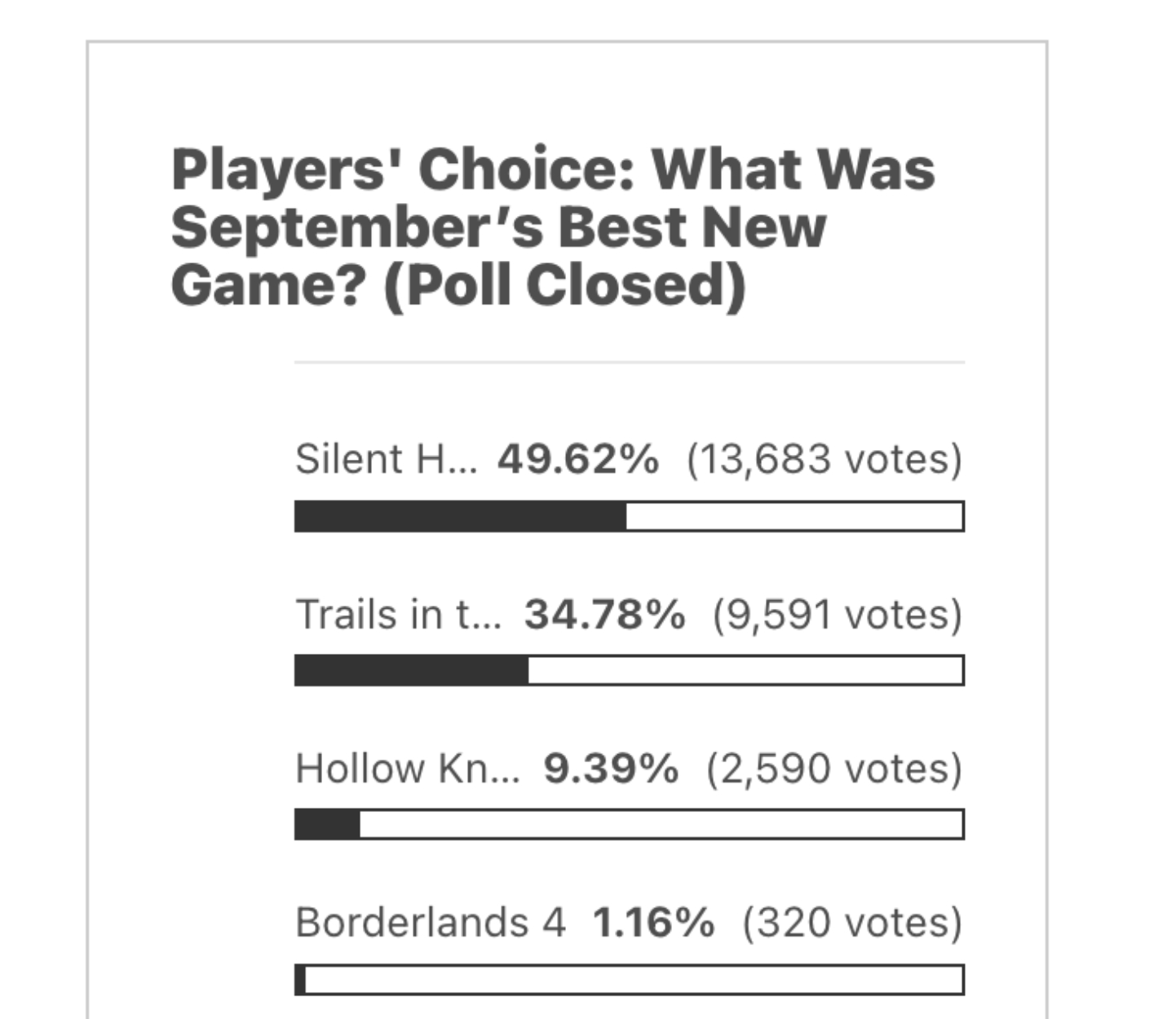 索尼宣布《寂静岭f》以接近半数的支持率荣获9月PS玩家选择奖,超越了《空之轨迹 the 1st》和《空洞骑士:丝之歌》。寂静岭f