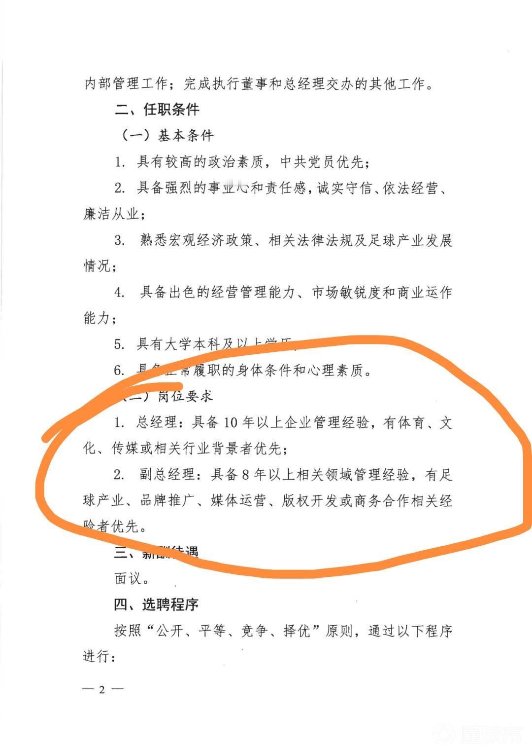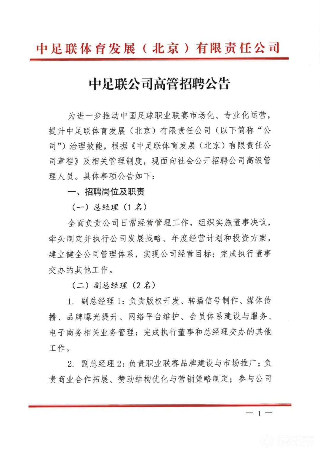 关心中国足球的,你行你可以上了,中足联公司公开招聘总经理和副总经理 大家都知道中足联是干什么的吧,大家吆喝了三十多年的“管办分离”去年终于实现了,中足联主要负责联赛,中超、中甲、中乙等赛事运营、商业开发、行业规范监督等都说了算,现在招聘当家人,那些天天为中国足球操碎心,有好多主意的人,可以上去试试了。 不过看了招聘条件,96%的球迷恐怕不具备,比如总经理得具备10年以上企业管理经验,有体育、文化、传媒或相关行业背景者优先; 副总经理具备8年以上相关领域管理经验。 中国足球