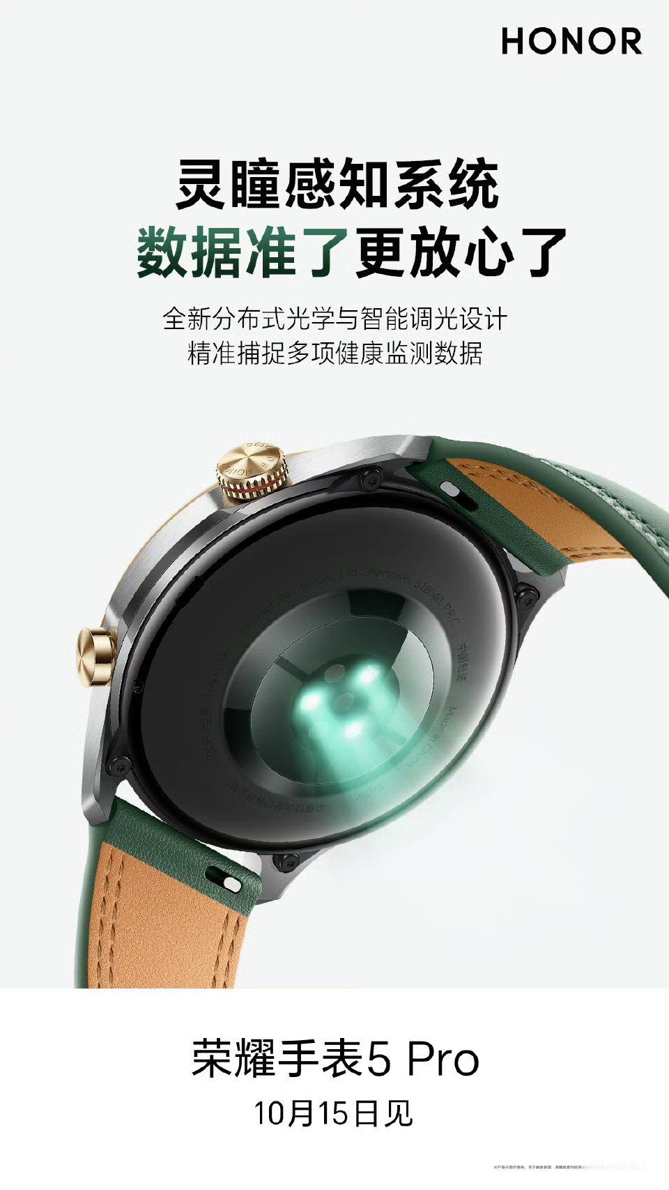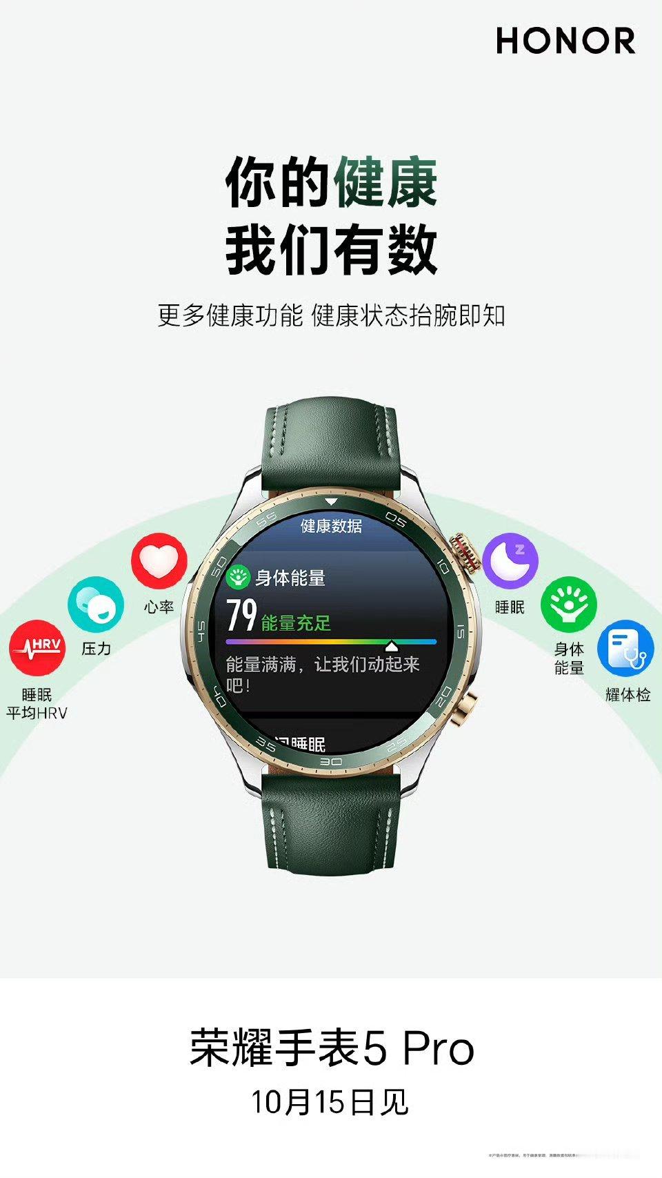 荣耀智慧生活官微宣布:“荣耀最强健康监测智能手表”荣耀手表 5 Pro 将于 10 月 15 日正式发布。