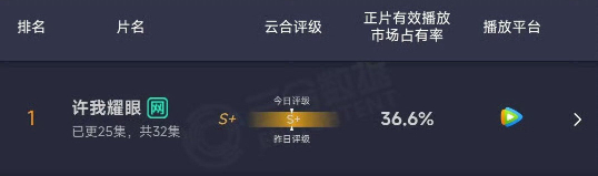 《许我耀眼》凭借亮眼数据保持登顶态势,这样的结果体现出观众对剧集的持续支持。这样的成绩,让剧集在同期作品中更显突出。许我耀眼36.6%许我耀眼36.6%继续登顶