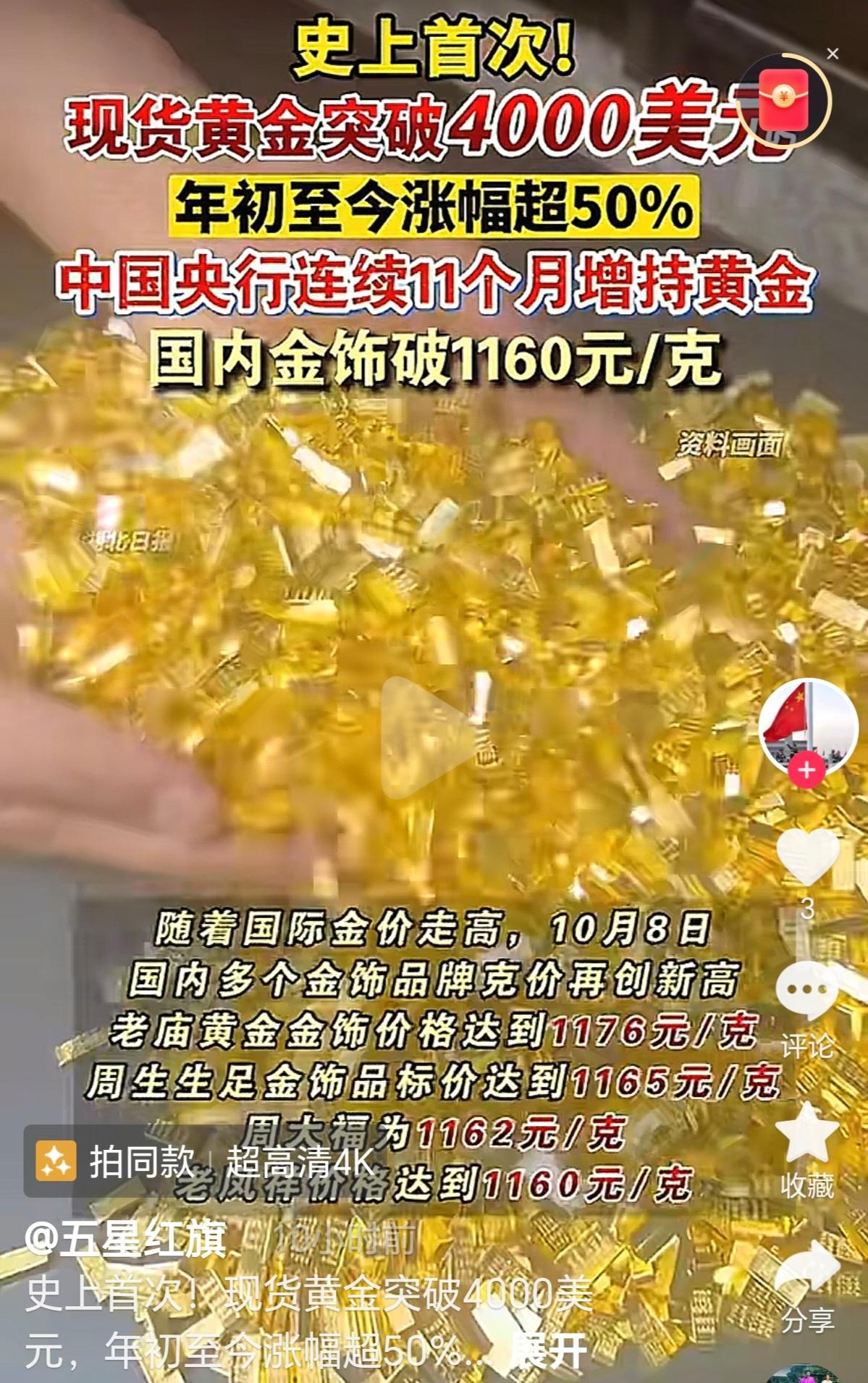 黄金狂飙突破4000美元/盎司 港股黄金股集体爆发 桥水基金创始人 黄金比美元更安全 黄金价格首次突破4000美元/盎司,真是让人眼前一亮!桥水基金的达利欧也强烈推荐配置黄金,他认为黄金比美元更安全,并建议在投资组合中配置15%的黄金。这波操作确实让很多人看到了黄金的投资潜力。 然而,金价涨得这么快,背后的原因也不少。全球经济和地缘政治风险不断增加,比如美国政府停摆、法国总理辞职、日本政局变动等,这些因素都推动了避险需求。机构和散户纷纷涌入黄金市场,使得金价一路攀升。 高盛更是大胆预测,将2026年的金价目标上调至4900美元/盎司,并预计各国央行会继续增持黄金。听起来是不是很有吸引力?不过,有些分析师提醒说,短期内可能会有回调的风险。毕竟涨得太快了,投机性获利了结可能导致价格波动。 那么问题来了,你觉得现在是买入黄金的最佳时机吗?还是应该再等等看呢?