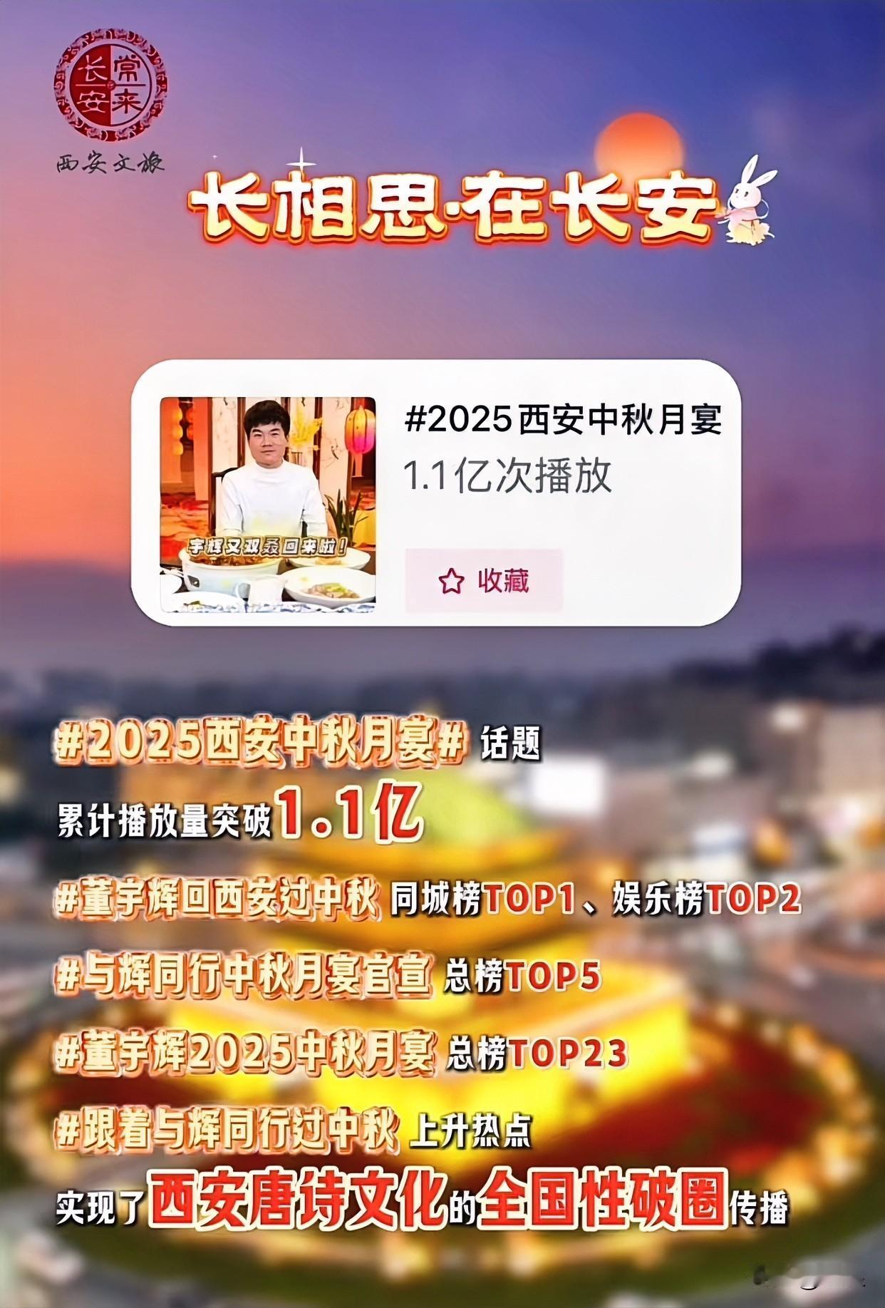 西安文旅刚刚发布了战报 董宇辉中秋月宴成功实现破圈 抖音端曝光2.5亿+ 累计播放量1.1亿 三项核心数据均为抖音全站第一 还上了各种榜单,总榜第23 同城榜第一,娱乐榜第二 这些数据表明了一件事 在娱乐至上的时代 只要用心做事 文化也能引爆网络 西安文旅给的总结是 “此次中秋月宴不仅让唐诗之都 成为西安的文化符号 更成为带动文商旅高质量发展的强劲引擎” 一个官方组织给予了如此高的评价 可见董宇辉的这场中秋月宴有多成功[赞]