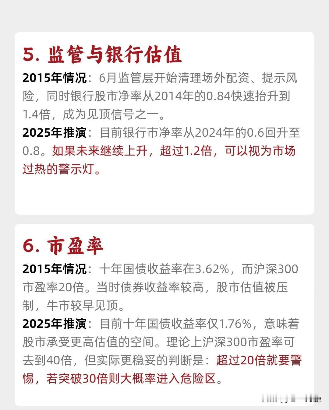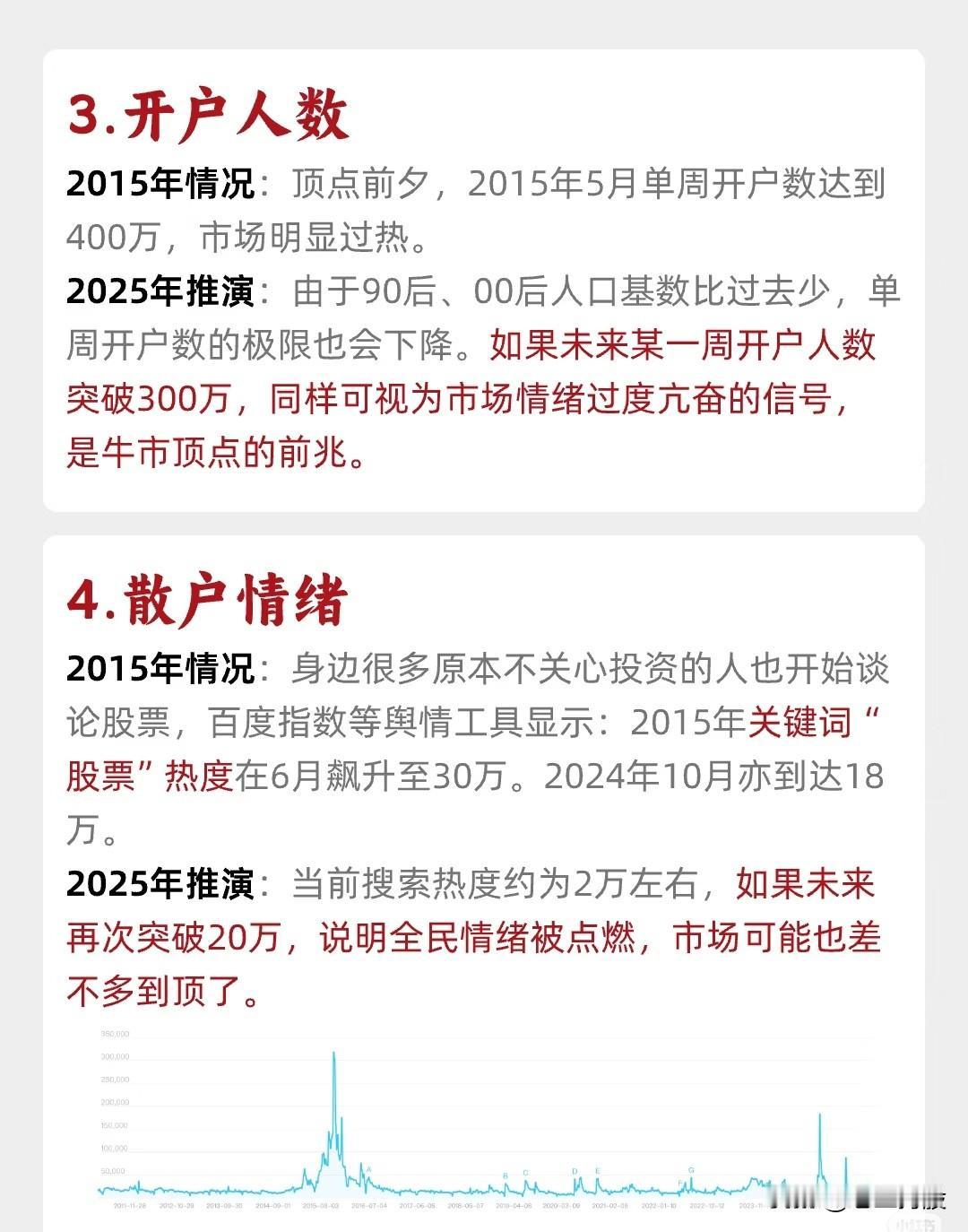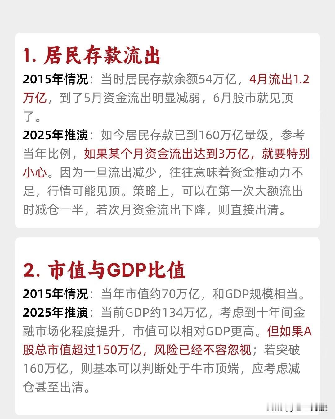 2025牛市可能的6个见顶信号 1. 资金面:单月存款流出3万亿是危险信号 居民存款是股市资金的重要来源,其流向直接反映市场资金的松紧程度。若单月存款流出规模达到3万亿,意味着大量资金从银行体系流向股市,短期资金流入达到阶段性极致。这种情况下,市场后续增量资金可能难以为继,反而可能因资金撤离引发调整。历史上,资金大规模集中流入往往伴随市场情绪过热,而流出则可能是顶部形成的重要信号。 2. 宏观比值:A股市值超过150–160万亿应高度警惕 A股市值与GDP的比值(巴菲特指标)是衡量市场估值合理性的关键指标。当A股市值超过150–160万亿(对应2025年预计GDP约140万亿),意味着巴菲特指标将达到107%–114%,进入高估区间。历史数据显示,2007年A股6124点时该比值为161%,2015年牛市顶点为113%,均处于高估状态。若市值进一步膨胀至150–160万亿,泡沫化风险将显著上升,需警惕顶部风险。 3. 散户开户:开户数单周超过300万,可视为市场情绪过度亢奋 散户开户数是市场情绪的“晴雨表”,单周新增开户数超过300万往往意味着市场情绪达到狂热状态。2025年7月新增开户数约111万户,虽较低迷时期回升,但相较于历史峰值(如2024年某轮行情单月近380万)仍显温和。若单周开户数突破300万,说明散户大规模非理性入场,成为市场的主要增量资金,而散户的“追涨杀跌”行为可能加速市场泡沫化,成为顶部的重要信号。 4. 搜索指数:关键词“股票”的百度指数突破20万,是差不多见顶了 百度指数反映市场关注度,当“股票”关键词搜索量突破20万时,说明市场关注度达到阶段性顶点。历史经验表明,搜索指数的飙升往往伴随市场情绪过热,散户大量涌入,而此时市场可能已进入上涨后期。过高的关注度意味着后续增量资金可能不足,反而容易引发调整。 5. 估值指标:银行市净率 >1.2,提示风险 银行板块作为A股的核心权重板块,其估值水平反映市场的整体风险偏好。银行市净率(PB)>1.2意味着市场对其资产价值的评估超过历史平均水平,可能暗示市场情绪过于乐观。当前银行板块估值仍处于较低水平(截至2025年10月,银行PB约0.5),但若PB升至1.2以上,说明市场对权重股的估值溢价过高,可能引发估值回调风险。 6. 估值指标:沪深300市盈率 >20倍,提示风险 沪深300指数代表A股核心资产,其市盈率(PE)是判断市场整体估值的重要指标。沪深300 PE>20倍意味着市场对其盈利增长的预期过高,可能脱离基本面。截至2025年10月,沪深300 PE约14倍,处于历史合理区间(近10年中位数约12倍)。若PE升至20倍以上,说明市场估值过高,风险积聚,需警惕顶部形成。