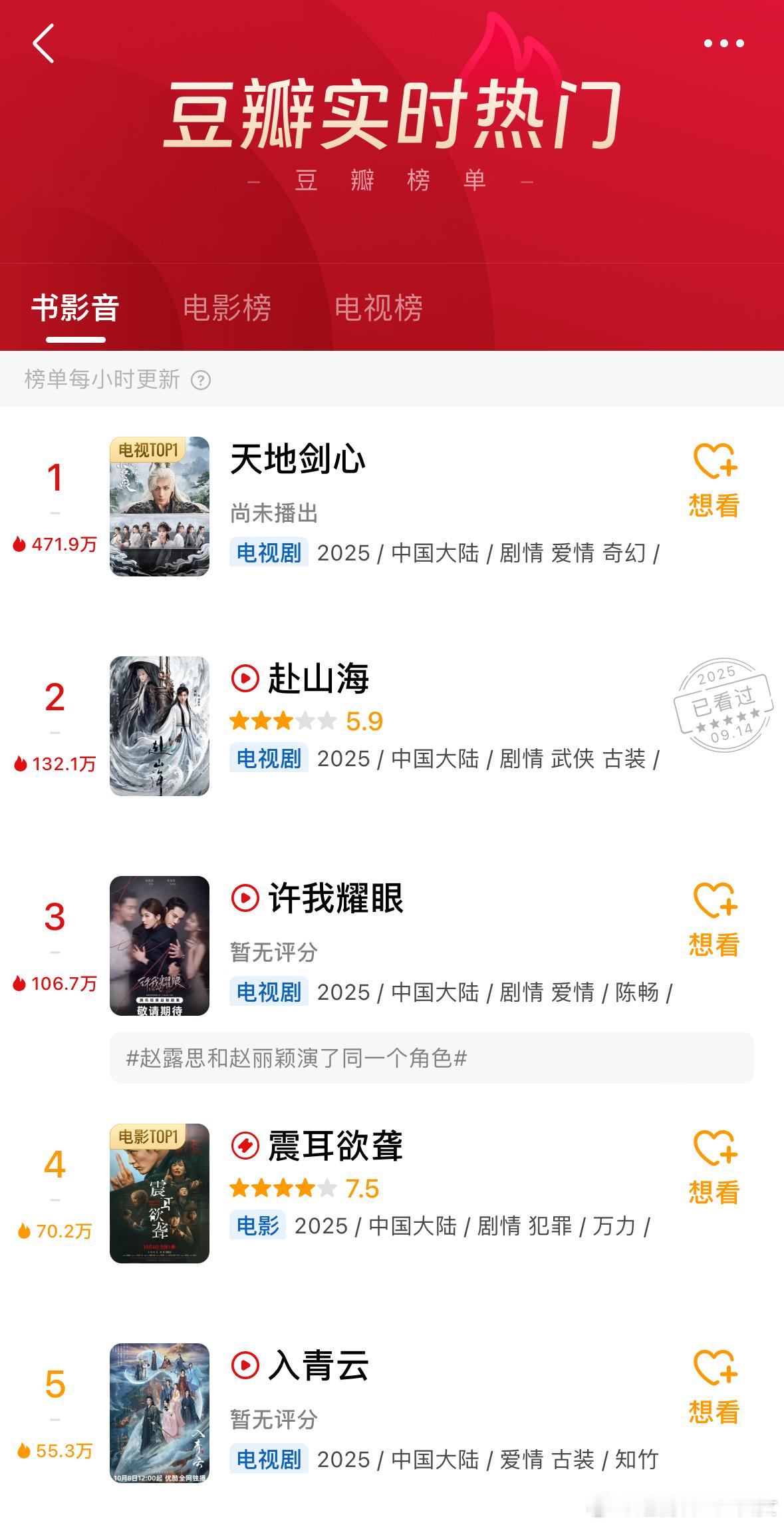 成毅的剧就是让人有讨论欲啊,天地剑心今天刚下证,豆瓣实时热度就第一了,第二也是他刚播完的赴山海,比在播剧热度高多了。长剧市场播剧最怕红黑俱灭,而成毅的所有剧真真切切可以看到大量活人的讨论度,剧粉盘很大,盘活了各大论坛