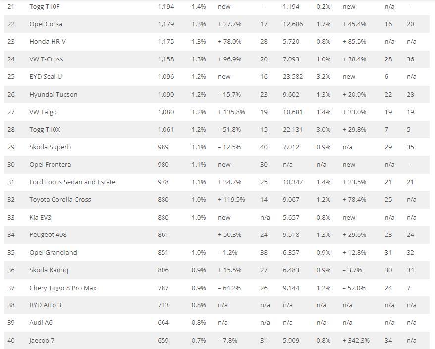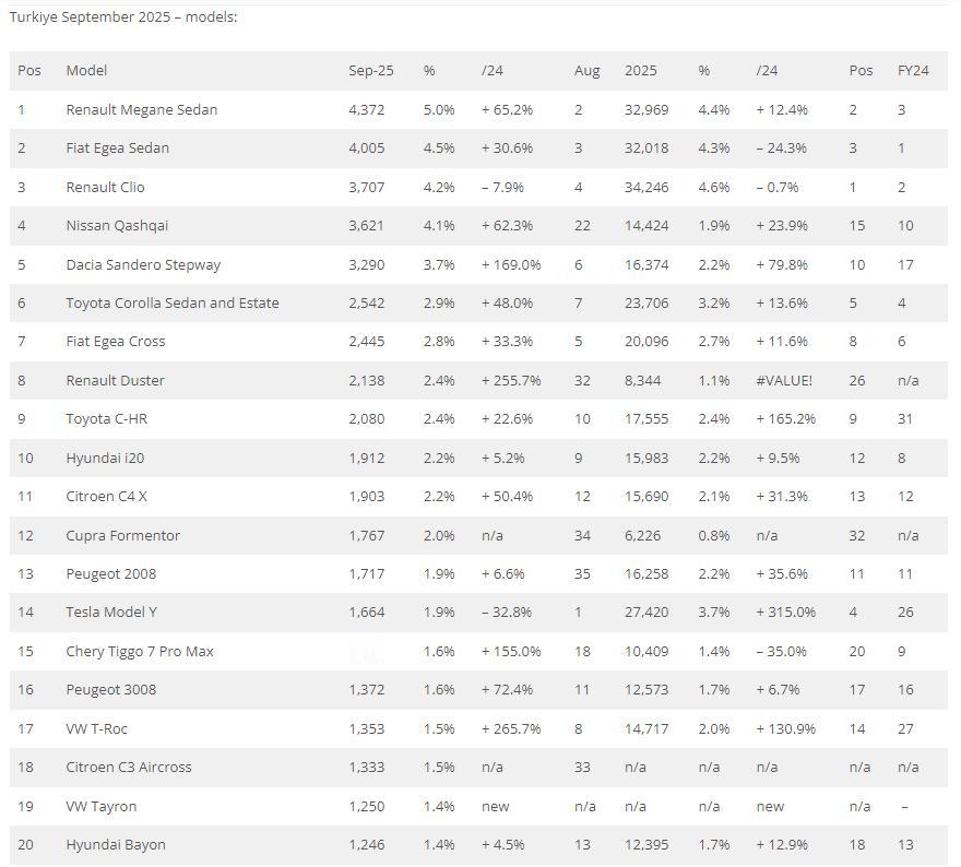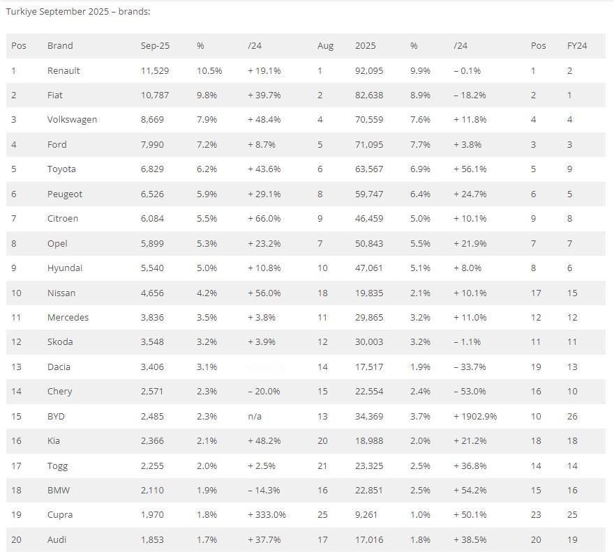9月,土耳其车市激增,中国车企表现不佳! 9月,土耳其车市高速增长。雷诺、大众等传统车企占据领先优势,特斯拉,比亚迪等新能源车企表现不佳。奇瑞同比下滑幅度收窄,9月表现排中国品牌第一。中国品牌在土耳其市场最近几月表现疲软,前景不容乐观。 2025年9月,土耳其新车销量同比激增25.7%,达110,302辆。 2025年1-9月,累计销量同比增长9.1%,达927,647辆,创同期历史新高。 土耳其本土车企Togg推出的第2款车型,Togg T10F以1.4%的市场份额排名第21位,但其首款车型Togg T10X在9月暴跌51.8%,排名下滑至第28位。 中国品牌表现不佳: 奇瑞:2571辆,市占率2.3%。 比亚迪:2485辆,市占率2.3%,连续3月环比下滑。(6月销量6857辆,6月市占率5.8%;7月销量3783辆,市占率3.5%;8月销量2600辆,市占率2.6%) 奇瑞Jaecoo:659辆,市占率0.6%。 福田:114辆。 名爵:90辆。