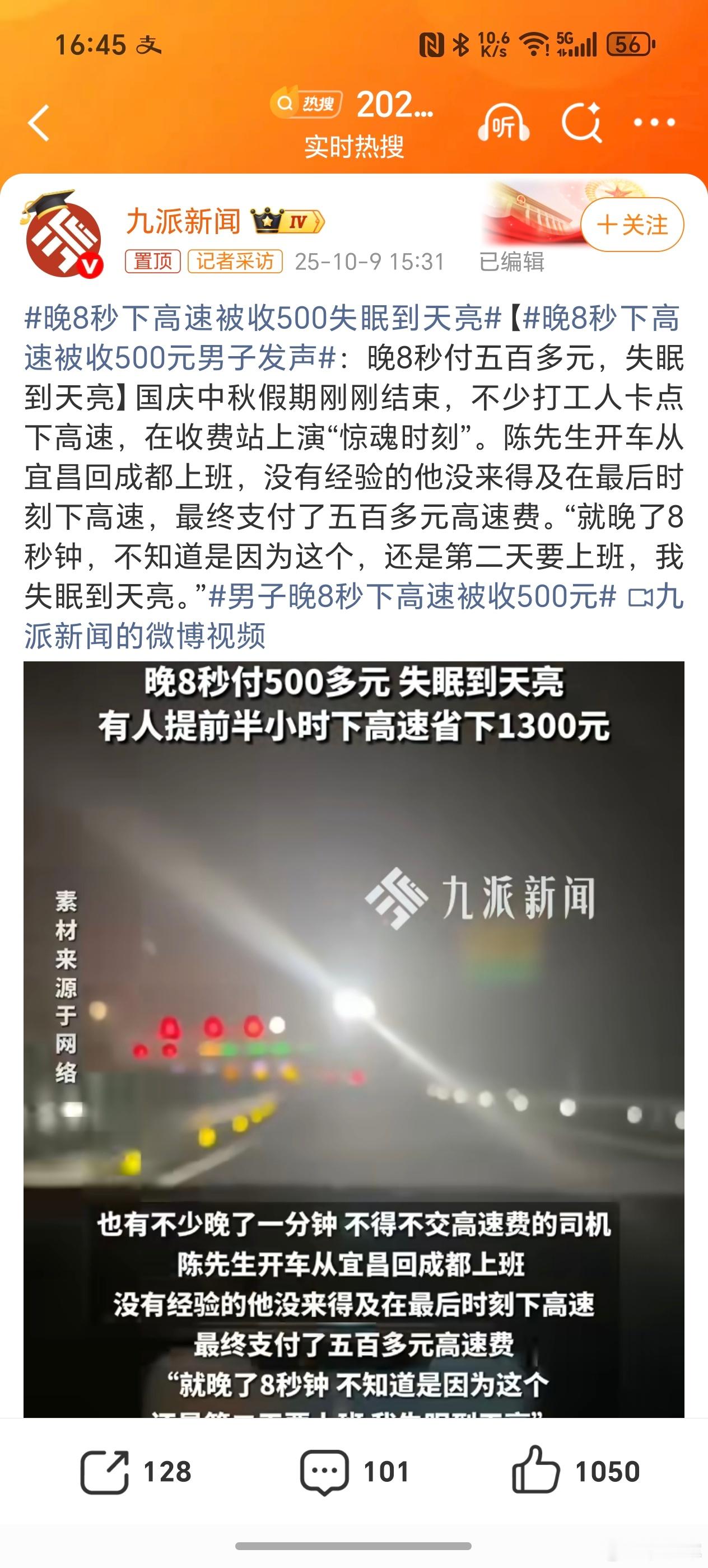 晚8秒下高速被收500元男子发声为啥不在上一个高速路口下高速呢?这花了五百多块钱