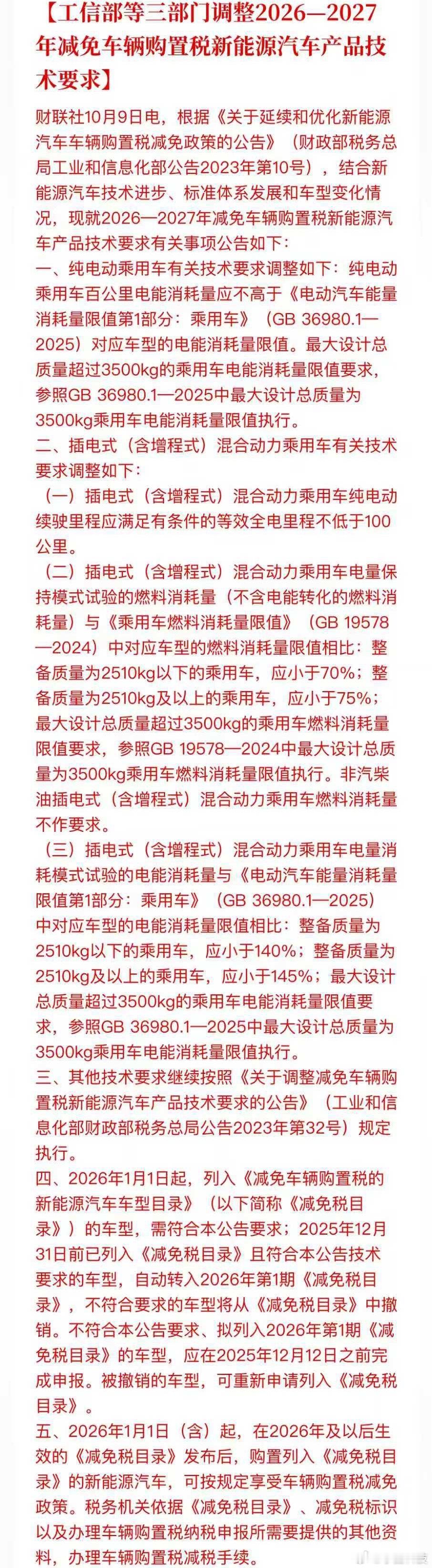 购置税大体看了下,按要求混动车要降低油耗,不然没有购置税补贴。纯电对电耗也设置了门槛。不知道主流新能源汽车厂商有没有不符合要求的,当然这一波利好蔚来是肯定了,而且对固态电池发展也有促进作用。