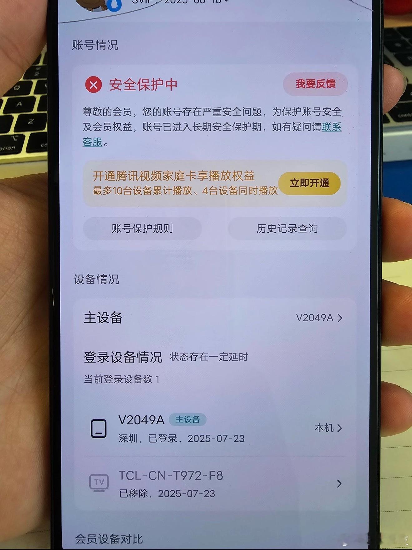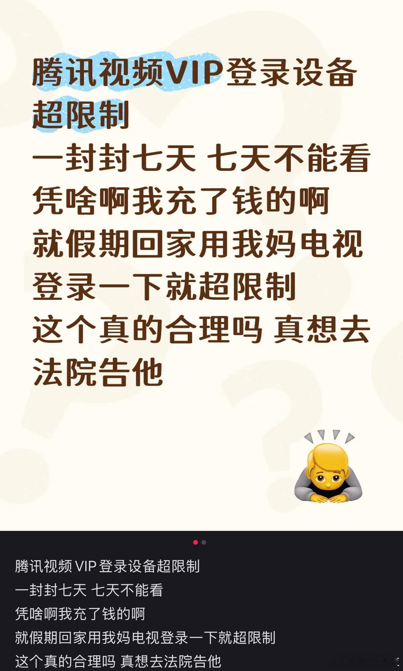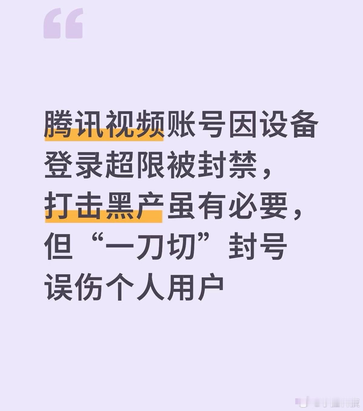腾讯视频账号6次超限或面临封号理解平台设置上限,你可以提示在线设备已达上限,如要登录新设备需下线其他设备,但封号就真的过分了。