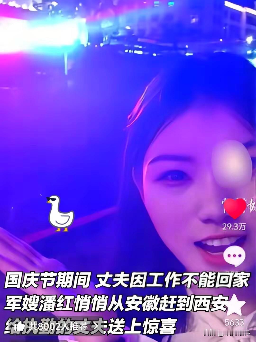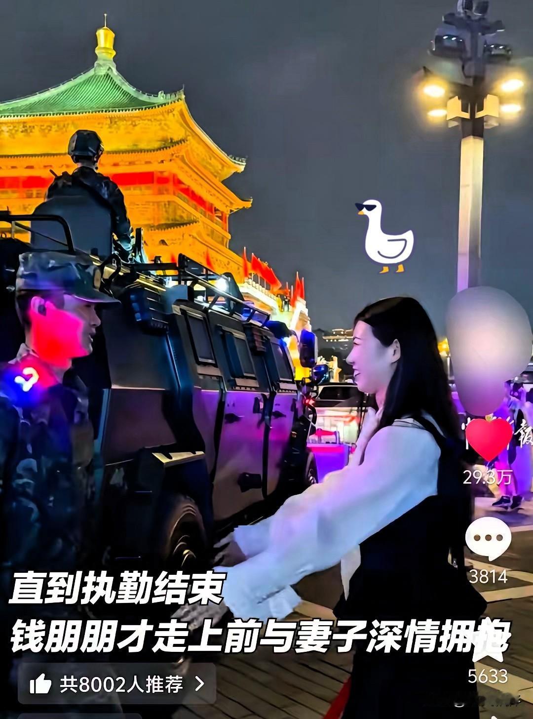 一位安徽妻子,知道丈夫国庆不能回家,便坐车去西安找他。令人意外的是,丈夫见到她,只看了一下,就扭头没吭声。原来她丈夫是名军人,国庆期间在西安执勤,她特意从安徽出发,跨越八百里赶到西安,就是为了给丈夫一个惊喜。 这八百里路她坐了很久。火车轰隆隆响,她一直想着丈夫看见她会是什么表情。现在她知道了,那个眼神她一辈子都忘不掉。 军人的感情藏得很深。我认识一个边防战士,他媳妇生孩子那天他正在巡逻。等收到消息已经是三天后,这个一米八的汉子蹲在哨所后面哭了十分钟,哭完继续站岗。 潘红站在人群里等了三个小时。她看着丈夫像松树一样笔直地站着,汗水把军装后背浸湿了一大片。她突然明白,不是他不想抱她,是肩上的责任让他必须忍住。 去年国庆也有类似的事。一个消防员在景区执勤他女儿偷偷跑去看他。小女孩想扑过去抱爸爸,却被妈妈轻轻拉住。孩子不懂事,但大人知道那身制服代表什么。 直到换岗的时候,钱朋朋才跑过来紧紧抱住妻子。这个拥抱憋了整整三小时,所有的思念都化成了力气。旁边游客都在拍照,但他们根本顾不上这些。 军婚就是这样。你永远不知道下次见面是什么时候,也不知道对方下次会在哪个城市。但正因为难得,每次相聚都特别珍贵。 我老家有个军嫂,她丈夫在岛上守了五年。每次她去探亲要坐船转车折腾两天。有次遇上大风浪,她在码头等了一天一夜。她说等待的时候最难受,见面的那一刻什么都值了。 视频发到网上后,很多人说又被骗了眼泪。其实大家哭的不是故事,是想起自己生命里那个想见却见不到的人。 各位读者你们怎么看?欢迎在评论区讨论。