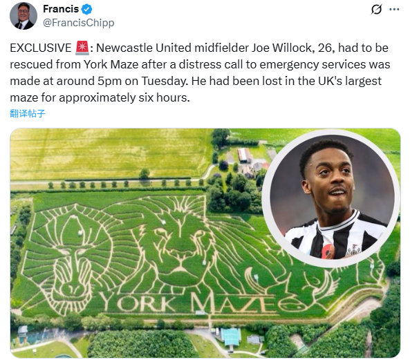 【[吃惊]】纽卡斯尔联26岁中场威洛克于周二下午5时许在约克迷宫被困约六小时后,经紧急救援人员成功救出。这座英国最大迷宫当时接到了求助警报。