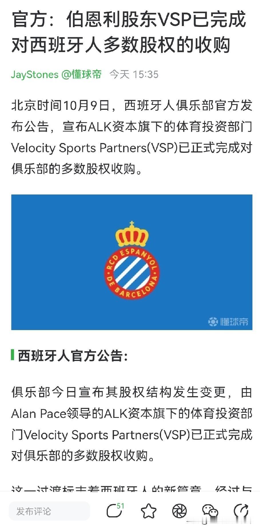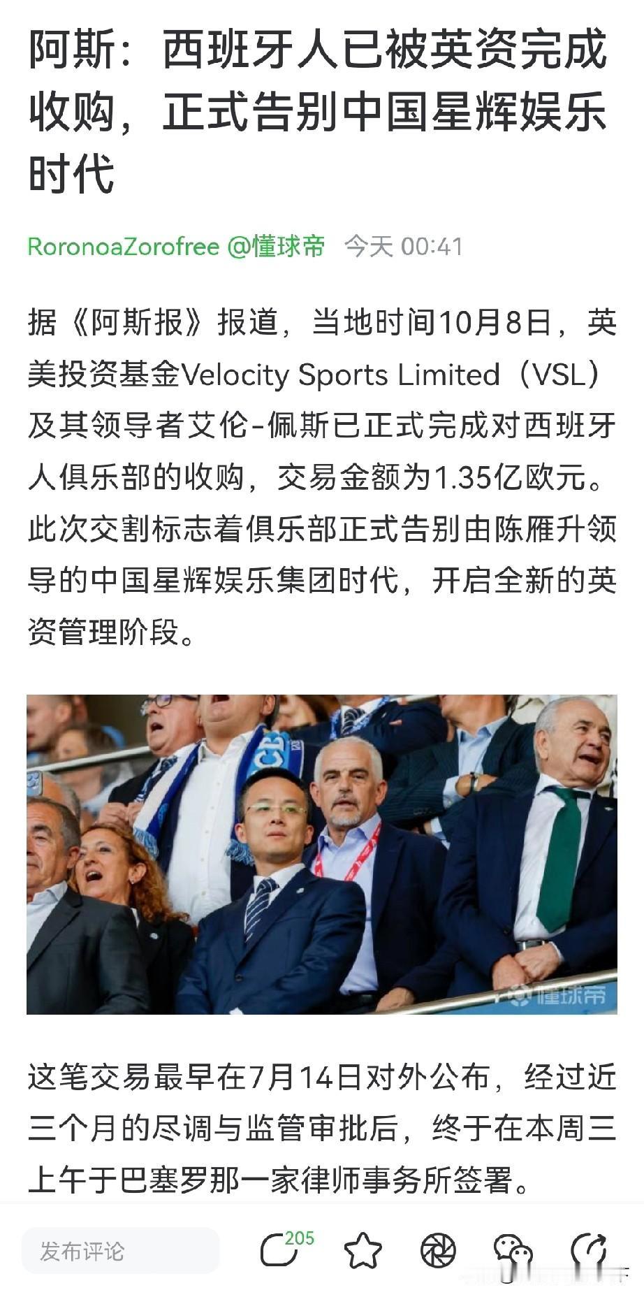 我说今年西班牙人咋这么强呢!原来是彻底转让啦!这下西班牙人后武磊的时代彻底结束了。西甲的中资球队也彻底结束了。 现在欧洲五大联赛中资球队只剩法甲的欧塞尔,还有复兴老板郭总的狼队了。 话说陈老板这卖的也太便宜了吧?竟然1.3亿欧打骨折卖了?市场价最少值3亿欧吧? 不过能及时变现也是极好的,毕竟现在现金为王! 其实也要感谢陈老板在中国足球的低迷期给球迷带来了欢乐,支持了吴磊留洋的梦想,打进了宇宙队可以吹一辈子的进球,每一个历史时刻都是创造了记录,回忆当中还是有很多美好的画面!