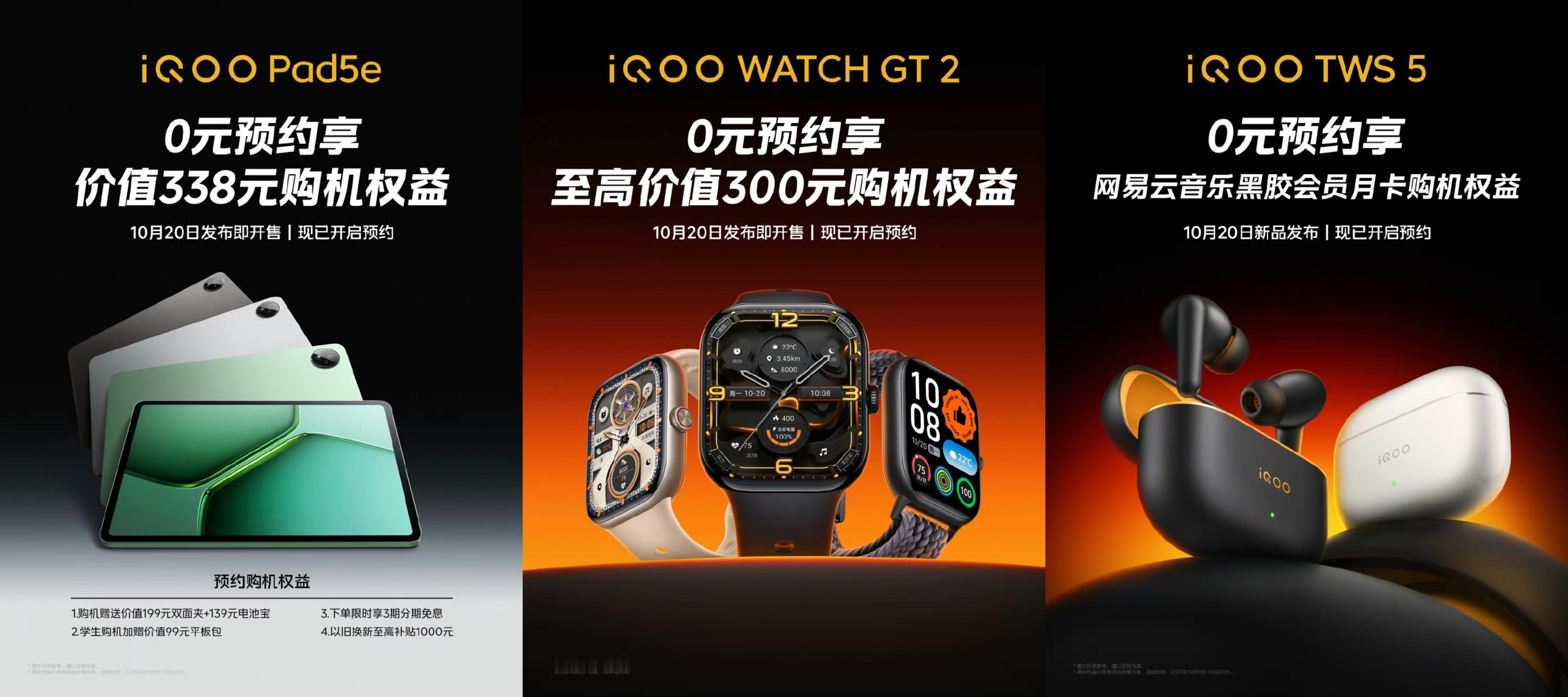 除了iQOO 15之外,这次发布会也会发布iQOO Pad5e、iQOO WATCH GT 2、iQOO TWS 5,10月20日发布即开售,所以我建议这次想买iQOO新品全家桶的同学先去官网预约福袋,第一时间拿到手机,还能获得专属福利,好好体验,这场发布会不容错过。
