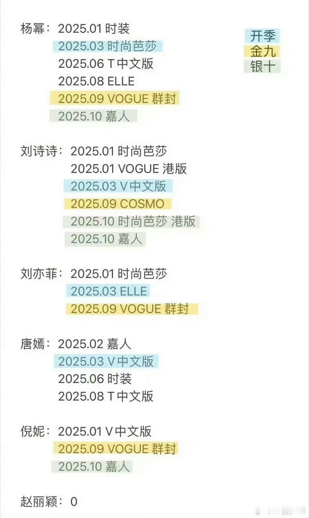 85花2025年主流女刊封面85花今年主流女刊封面 救命!杨幂、刘诗诗、刘亦菲的2025封面实绩太能打!刘诗诗以CELINE全球品牌大使身份横扫《嘉人》《时尚芭莎》等多本大刊,双封面造型又美又飒;刘亦菲四登《VOGUE》稳坐C位,宝格丽珠宝衬得她仙气又贵气;杨幂凭《生万物》热度拿下《VOGUE》金九资源,国风造型尽显张力。85花的时尚统治力,果然从不让人失望!