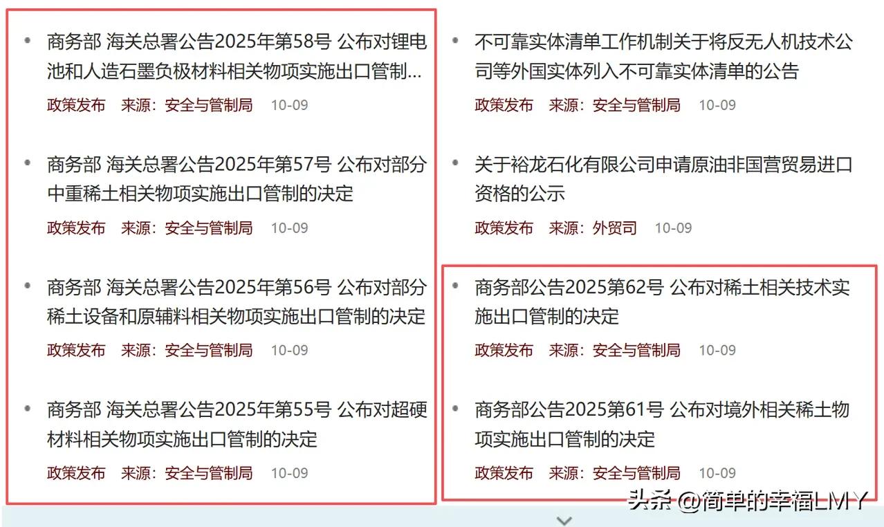 中美新一轮谈判将至,中国商务部一天发布6则公告,打破特朗普政府不切实际幻想! 十一长假后首个工作日,商务部用6则公告打响了中美谈判前的关键一枪。上午9点,编号61、62的公告率先发布;下午5点,公告55至58紧随其后。 密集出台的管控措施直指稀土、稀土生产技术及锂电池等物项,把对这类战略资源的出口管控拧得更紧。这波操作精准有力,直接击碎了特朗普政府想靠施压逼中国让步的迷梦。 谁都能看出,这绝非无的放矢的常规调整。9月底,特朗普政府赶着中国国庆假期到来前,抛出了一道针对先进芯片的制裁新政。新规把管控网撒得更宽:企业只要被列入美国“实体清单”,其控股超50%的子公司会自动被拉进制裁名单。 哪怕持股不足半数,相关子公司也要过一遍更严苛的审查关。明眼人都清楚,这是故意给中国添堵,更是想在新一轮中美贸易谈判前摆足架势,用极限施压的老套路逼中国妥协。 可他们忘了,中国手里早握着一张能直击对方软肋的王牌。 稀土这东西,被称作“工业味精”可不是浪得虚名。17种稀土元素藏在智能手机、风力发电机里,更撑着F-35战斗机、攻击核潜艇这类尖端武器的制造根基。 更关键的是,92%的稀土加工产能都攥在我们手里。尤其是更稀缺、更难加工的重稀土,中国的产能占比更是高得惊人,全球几乎找不到可替代的分离加工来源地。美国战略与国际问题研究中心的报告说得直白:面对中国的稀土优势,美国压根没辙,只能干瞪眼。 这次商务部出台的管控措施,简直是打在了美国的“七寸”上。不仅堵死了境外中间商把中国稀土转手卖给美国企业的路子,连稀土加工技术的出口都卡得严严实实。要知道,美国自己的稀土产业链早就断了档。 被寄予厚望的美国稀土巨头MP Materials公司,去年八成营收都靠把稀土精矿卖给中国加工,如今因为关税壁垒,这生意已经“不具商业可行性”而彻底停滞,股价一度暴跌超10%。 他们虽想砸10亿美元重建本土产业链,可连分离重稀土的生产线都没有,光建厂就得耗上数年,投入更是个无底洞,就算建好了产能也远不够自给。 美国不是没想过找替代方案。一会儿打格陵兰岛的主意,一会儿盯着乌克兰的稀土资源。 澳大利亚的莱纳斯公司算是中国以外最大的稀土分离企业,可至今还得把氧化物运到中国精炼,2026年前都离不开中国的技术支持。美军更清楚其中的利害——现役和在研的153种主战装备里,87%的供应链都要过中国稀土加工这一关。 现在中国收紧管控,美国的军工、新能源等产业随时可能面临“断粮”风险,这可不是加征关税能解决的麻烦。有人说中国是把稀土“武器化”,这纯粹是误解。商务部早就明确了,实施出口管制是依法维护国家安全,也是履行防扩散国际义务的常规操作。 稀土相关物项兼具军民两用属性,之前就有境外势力把中国稀土转用到军事敏感领域,这种风险必须防住。而且中国从不是要禁止出口,而是要规范行业发展——要是继续粗放开采,不光中国的稀土储备会枯竭,全球供应链反而更不稳定。 这次政策还特意留了余地,人道主义救援等合规需求能申请豁免,既有商业合同的企业也有合理过渡期,负责任大国的担当看得见摸得着。特朗普政府以为靠芯片制裁就能拿捏中国,殊不知这是典型的“只许州官放火,不许百姓点灯”。 美国想卡中国半导体的脖子,却不愿接受自己在稀土领域的短板,这种双重标准根本站不住脚。CNN都承认,在稀土领域中国拥有“绝对优势”,这张牌的威力远超关税,特朗普政府连反击的余地都没有。 之前他们总幻想靠施压让中国服软,如今6则公告一落地,这份不切实际的幻想该醒醒了。接下来的中美博弈,大概率会围绕稀土和半导体这两个领域展开更激烈的交锋。 美国想重建产业链,中国要守护战略优势;美国想维持技术霸权,中国要争取发展空间。这时候比的就是谁更有战略定力。中国的管控措施不是一时冲动,而是基于自身优势的理性回应。 既守住了国家安全的底线,也给全球供应链的稳定提了个醒——把鸡蛋都放在一个篮子里本就危险,试图用霸权打破产业平衡,最终只会反噬自身。 特朗普政府该明白,贸易谈判从来不是靠施压能谈成的,拿国家安全当筹码更是行不通。中国手里的稀土牌,本质上是几十年产业积累的结果,是市场规律的选择,不是用来威胁谁的工具。 可要是有人非要把谈判桌变成施压台,那中国自然有底气接招。这场较量里,谁在实事求是,谁在自欺欺人,答案早已写在那6则公告里,写在全球稀土产业链的格局中。