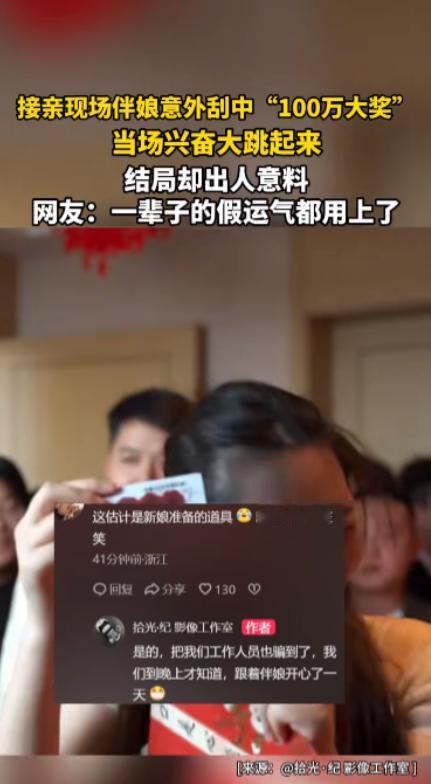 “电视剧都不敢这么演!”近日,一位伴娘在接亲现场玩刮刮乐游戏时,竟然意外刮出了一个“100万元” 的一等奖大奖,伴娘为此激动不已,谁知新娘一句话却让伴娘当场傻眼!网友:这就是人生的大起大落啊。 如今越来越多的婚礼现场喜欢加入一些趣味环节,比如刮刮乐彩票,用来调节气氛、娱乐宾客,大家或许都见过或听说过类似的情况,但万万没想到,这个“中奖”的意外竟成了婚礼中的一场“心灵大冒险”。 这天新郎新娘的婚礼现场,气氛欢乐而热烈,为了让婚礼更添趣味感,他们特地准备了几张刮刮乐的彩票,送给了伴郎伴娘。 谁能想到,伴娘竟然在刮的一瞬间,刮出了“100万元”的大奖!彩票的中奖金额赫然写在上面,连旁边的宾客也纷纷围过来,一起祝贺,场面一度非常热烈,大家都被她的好运气惊呆了。 伴娘兴奋得几乎要飞起来,手舞足蹈地庆祝,好像这一百万已经是她口袋里的钱,瞬间觉得自己的生活可能从此发生翻天覆地的变化,连新郎新娘也为她高兴,大家一片欢腾,简直就是一个完美的庆祝时刻。 然而接下来的一句话,却让伴娘当场傻眼,彻底从天堂掉入了深深的“坑”中,新娘淡定地告诉她:“这个彩票不能兑现金,它只是道具,”原来,彩票并不是真的刮刮乐,而是新娘在网上买的假的道具彩票! 这瞬间像一盆冷水浇在了伴娘的头上,她的心情从云端直接摔了下来,那一刻她完全没法接受,原本以为会迎来改变命运的机会,结果却不过是一场精心安排的“空欢喜”。 现场气氛顿时发生了戏剧性转变,伴娘的笑容戛然而止,转瞬间,她的脸上写满了不可置信和失落。 宾客们见状,也意识到发生了什么事情,气氛从热烈转为尴尬,一时之间连摄影师也愣住了,原本他还在忙着记录“中奖”的精彩瞬间,结果成了他意料之外的一场笑话。 不得不说,这场婚礼的“刮刮乐”环节,虽然让现场所有人都惊呆了,但伴娘的失落也让人心生同情。 她本是充满期待和幸运的人,结果却被这份假彩票狠狠“打脸”,大家心里清楚,这其实不过是为了婚礼更有趣而设计的一个环节,但对伴娘来说,这种戏剧化的反转无疑让她尝到了人生的“大起大落”,这种情绪的波动,恐怕连电视剧编剧都不会想象得出。 实际上,这种情节的设置并不罕见,许多婚礼都会选择一些特殊的道具来调动气氛,尤其是在中国的婚礼上,“刮刮乐”已经成了一种常见的小互动。 然而把这种“道具彩票”作为一种喜庆的气氛制造方式,是否考虑过参与者的感受呢?毕竟谁能预料到刮出大奖的人会如此真心地庆祝,最后却被告知这只是个假奖项?这种心理落差也许会让人在某一时刻感到错愕甚至无奈。 人们总说,彩票是“靠运气”,但是,这种意外中奖的喜悦和随之而来的落空,往往更像是生活中的一种“现实剧”,每个人都可能在某个时刻经历这种大起大落,站在高处时满怀憧憬,而失望却常常悄然来临。 对伴娘来说,这无疑是一场巨大的心理过山车,她本以为生活的困境即将得到解决,却在最快乐的时刻遇到了冷酷的现实,这种情绪上的过山车,恐怕是婚礼上最意外的戏剧性转折。 但或许,正是这种突如其来的失落,才让人更加明白,婚礼不只是一个庆祝的时刻,它也可能是人生中一个难忘的教训。 这一切也许能让人意识到,生活中的确充满了不确定性,幸福和失落总是交替而来,而真正的“大奖”,也许不在刮刮乐的纸面上,而是在自己内心的积淀和成长中。 这场婚礼的插曲,让人不禁想,虽然“空欢喜一场”有些遗憾,但人生就是如此,充满了不可预见的意外与波动。 从这个角度看,刮刮乐的事件或许让我们更清楚地看到了生活的无常和戏剧性。 对于这件事情,大家有什么看法? 信息来源:《伴娘意外刮中“100万大奖”,当场兴奋大跳,结果竟是道具,网友:一辈子的假运气都用上了》观象视频