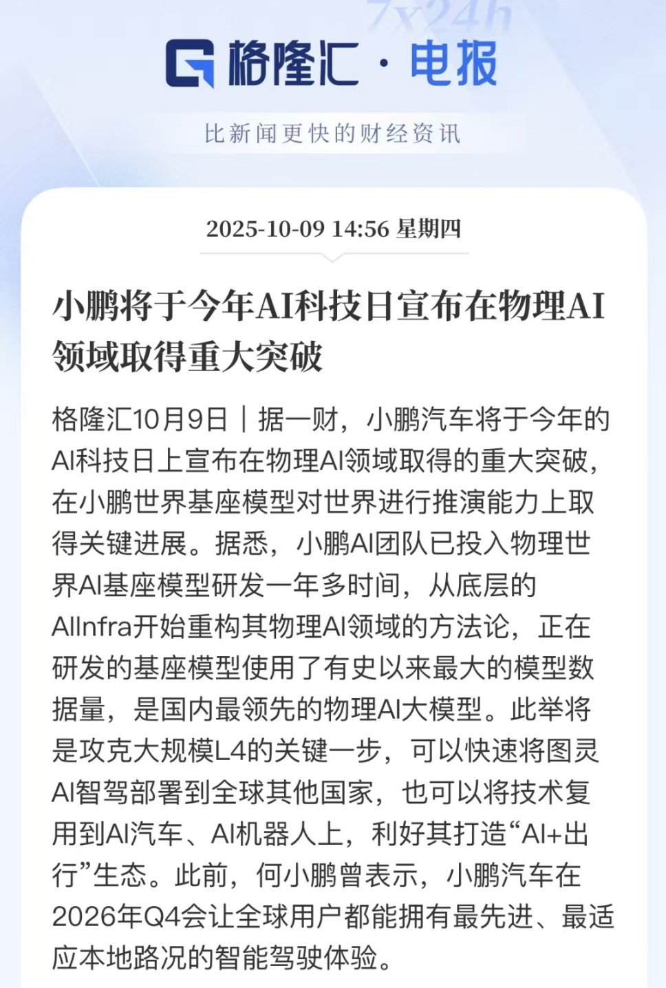 今年AI科技日,小鹏将宣布在物理AI领域取得的重大突破!