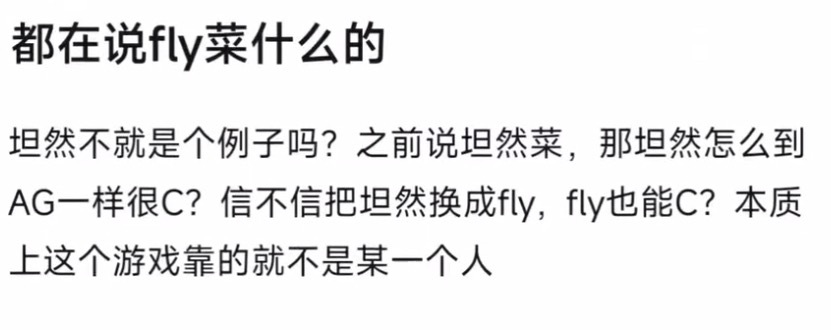 坦然不就是个例子吗?之前说坦然菜,那坦然怎么到AG一样很C?信不信把坦然换成fly,fly也能C?本质上这个游戏靠的就不是某一个人