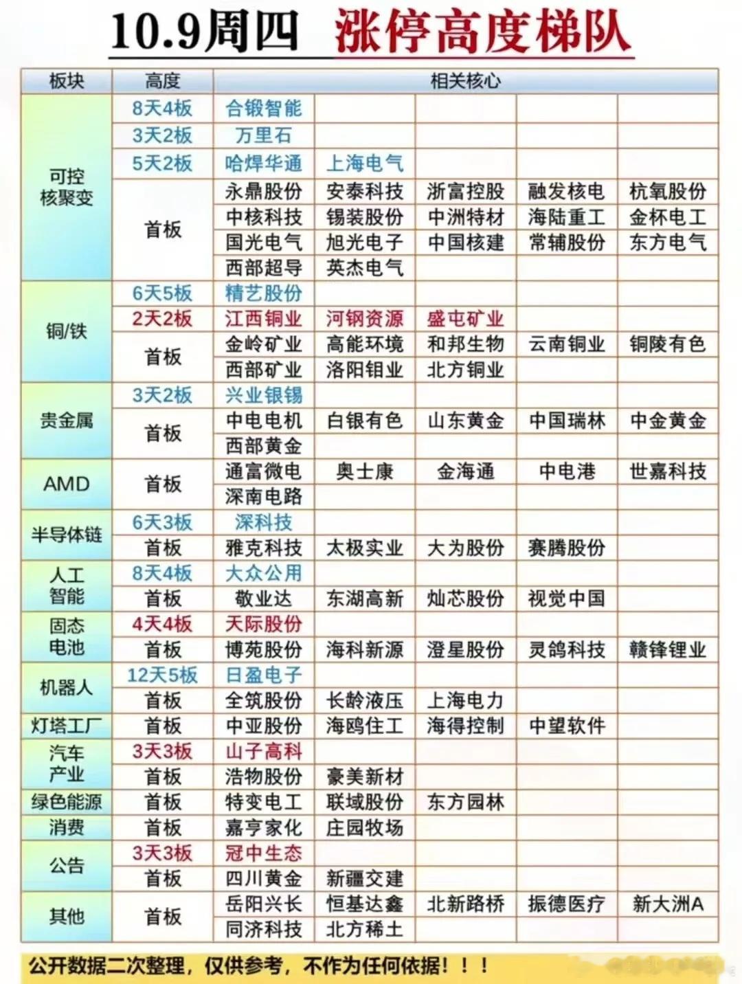 10月9日周四涨停个股数量最多的板块有可控核聚变概念、金属题材概念、AMD超威半导体概念、存储芯片概念、固态电池概念等等。