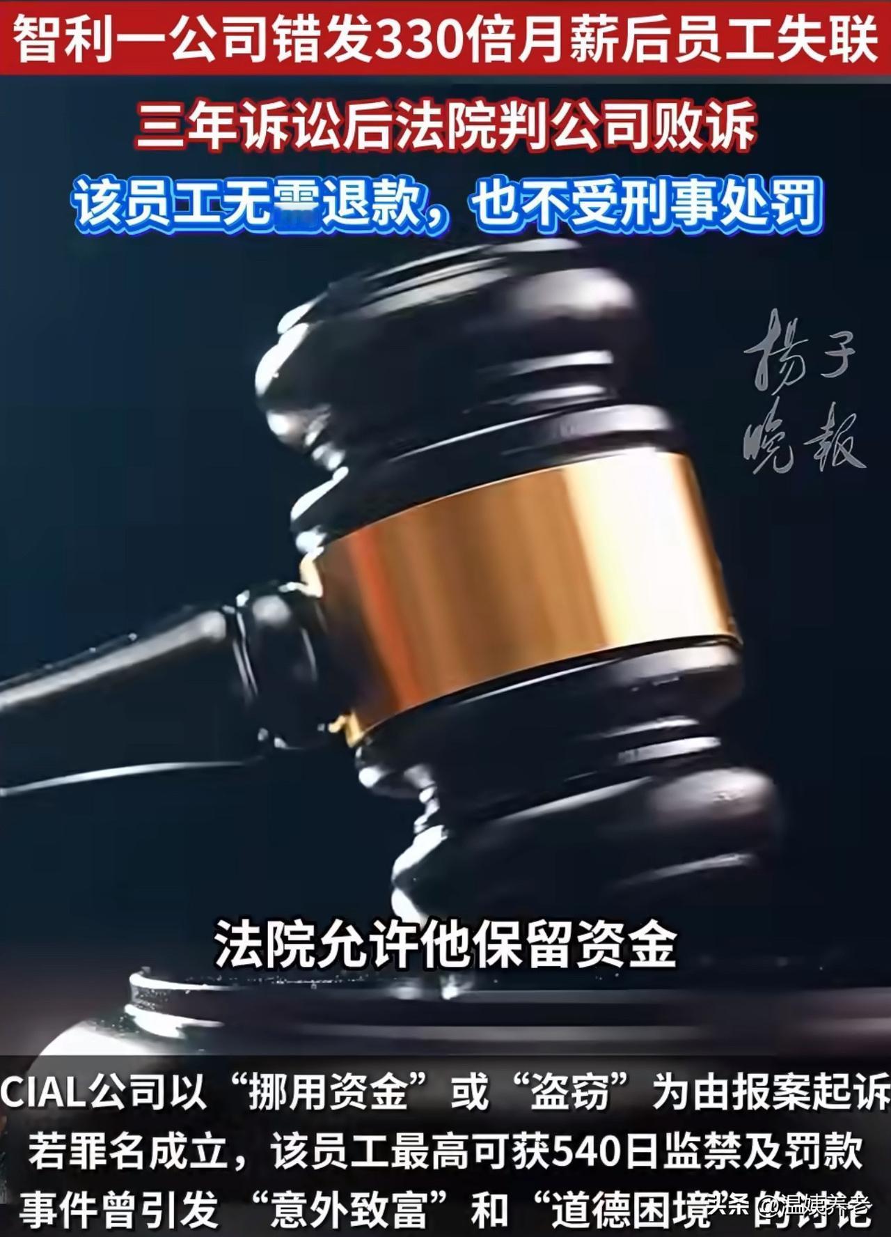 这新闻给我看笑了 公司错发330个月的工资, 法院判了:不用归还。 我还以为这是什么电视剧呢, 结果居然还是真事。 智利一家公司错发工资却不用归还, 我只想大喊一声, 这种剧情能不能发生在我身上啊!
