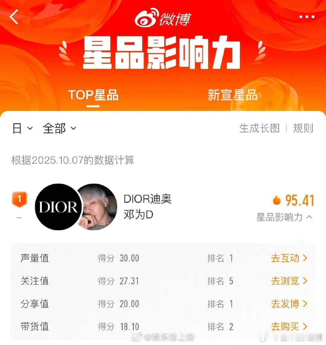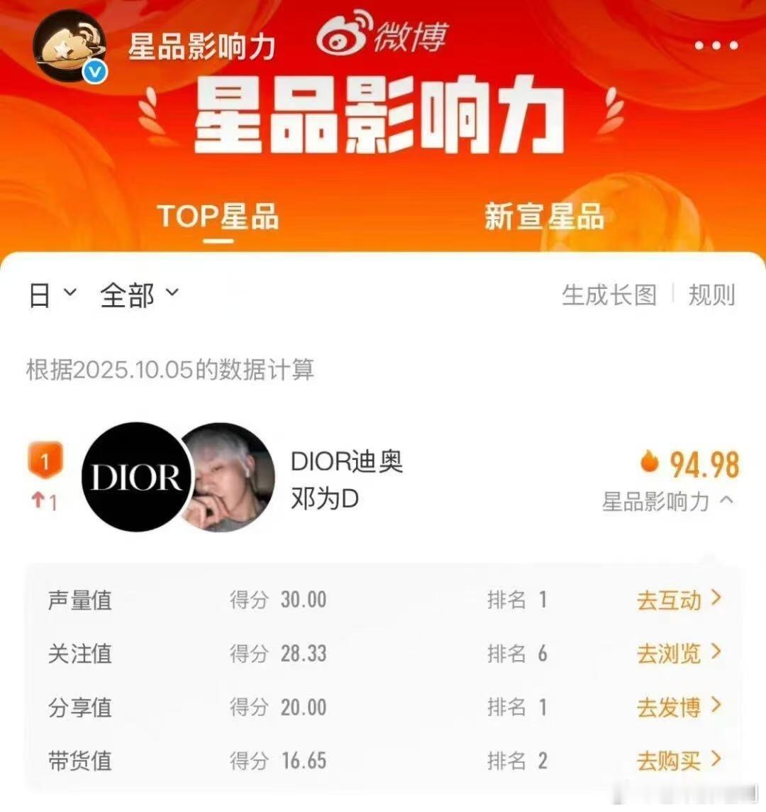 邓为 星品影响力top1,多日连续登顶,一趟巴黎时装周,包揽声量值、分享值、带货值第一,有效看秀、闪耀全球