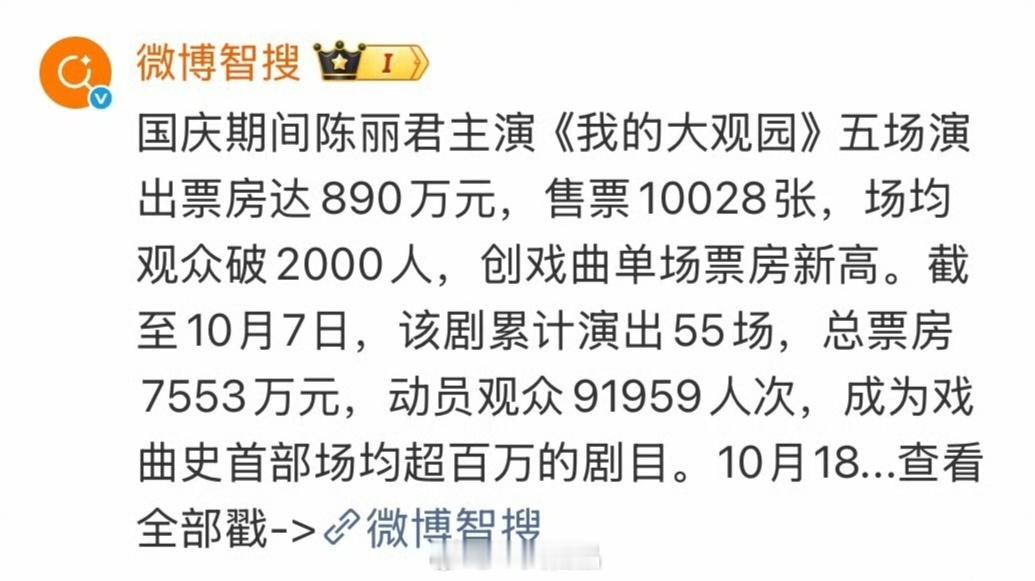 国庆中秋双节,陈丽君《我的大观园》又创造了记录,五场演出票房达890万元,售票10028张,场均观众破2000人 ​​​