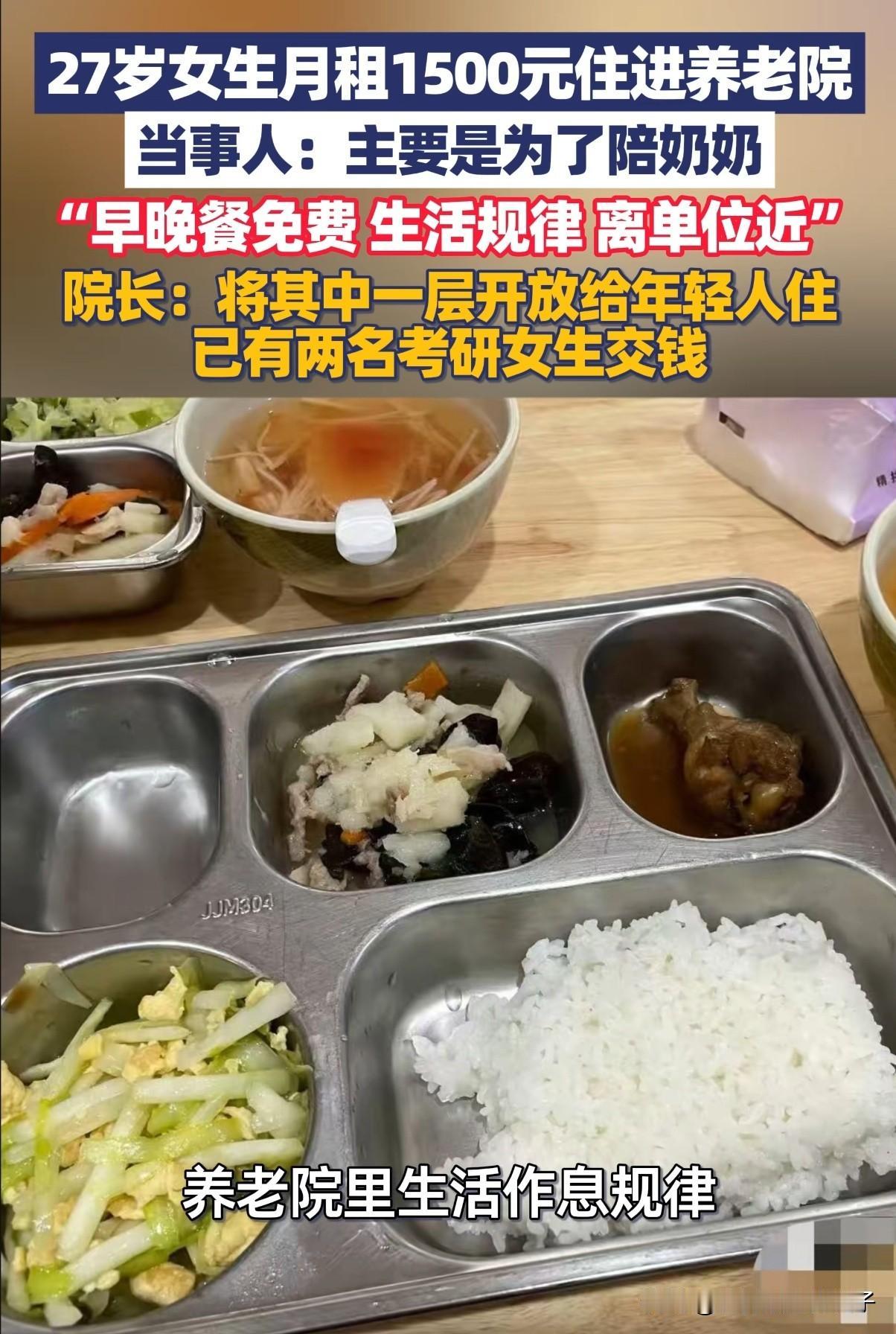 太有头脑了!浙江,27岁女生为了方便照顾奶奶,竟一同住了养老院,女生表示月租金才1500元,还包括早晚餐,而且养老院离她公司很近,上班也方便。 女生分享的帖子火了以后,不少网友看到女生晒的房间和饭菜,都觉得太值了,比租房划算多了,不少人给养老院打去电话咨询,询问什么条件可以入住。 养老院干脆将拿一楼整个楼层都对年轻人开放,统一租金1500元,但水电费需要自理,每月大概200元左右,目前已经有2名考研的女生准备入住。 对此,有网友表示,商机不就来了,可以弄一个“养青院”,专门针对躺平族和年轻人,生意肯定不错。 这条件看得我都心动了,赶紧算算存款能住多少年,等以后老了就去住!