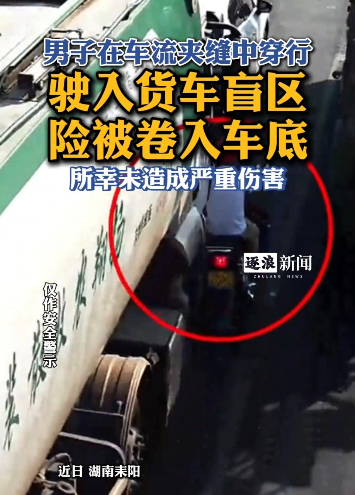 湖南耒阳刚上演一出“生死时速”,男子险被卷车底!让人看完手心发麻! 据逐浪新闻10月9日报道,就在近日,耒阳迎宾大道和神农路交叉口,遇到大堵车。一名男子没有停下来,而是偏要在车缝里钻来钻去,活生生上演“见缝插针”。 结果没把控好,直接窜进一辆大货车的盲区里。 下一秒差点被卷进车底,那场面想想都让人后怕! 万幸的是,两边货车司机反应快,一脚急刹踩住了,最终没造成严重伤害,但估计他这辈子都得有心理阴影了。 你以为司机坐在高处啥都能看见?错! 货车右侧1.5米内基本是“全盲区”,被称作“死亡弯月”,人站那儿是看不见。 别觉得抢那几秒钟划算,一旦闯进盲区,可能就是一辈子的代价。 所以安全这事儿,终究得靠自己绷紧弦。