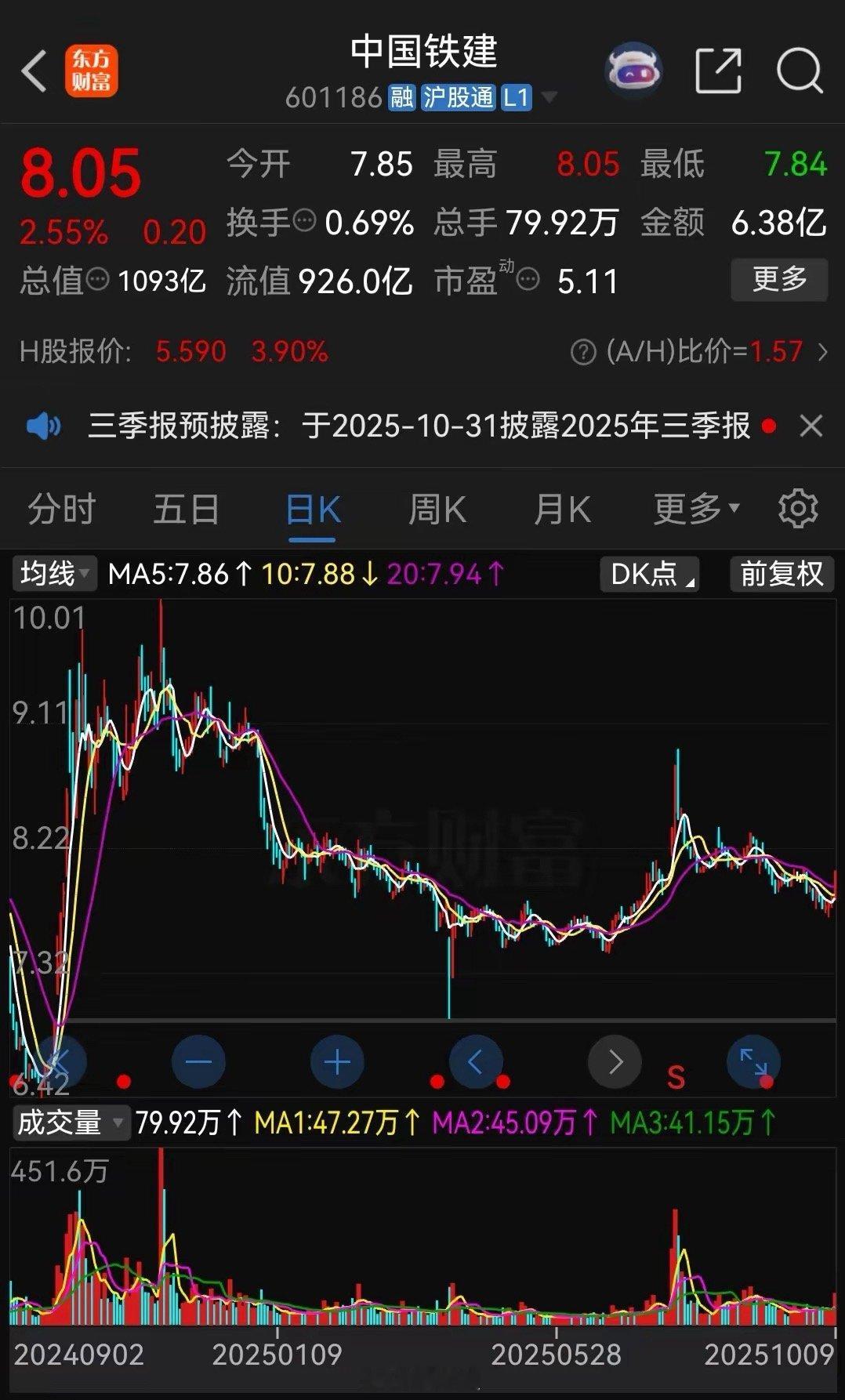 去年11月18日中国铁建最高涨到了10.01元,当时对应的大盘是3323点。今天大盘涨到了最高3936点,中国铁建股价却只有8.05元,相当于回到了大盘2800点的位置,落后大盘1000多点。