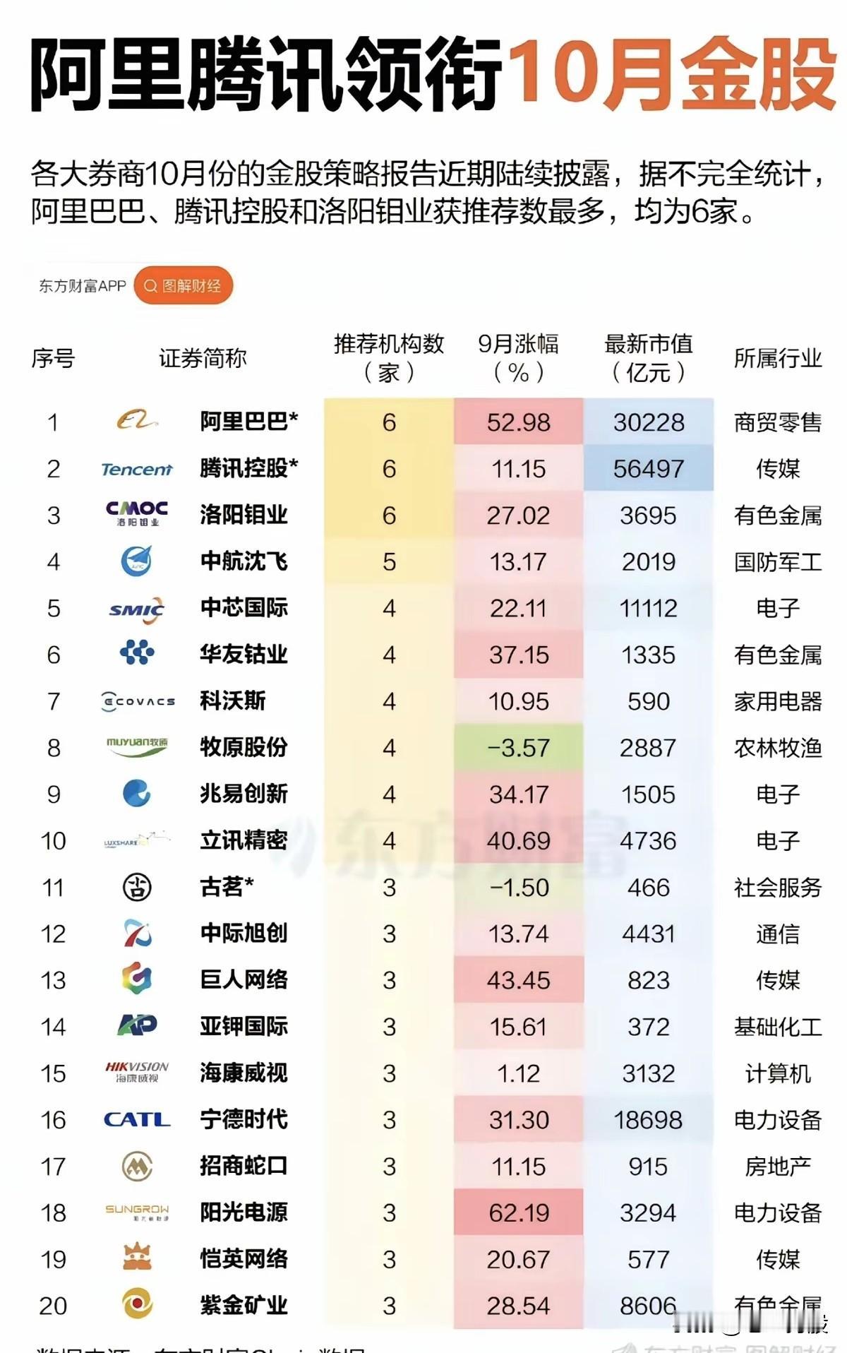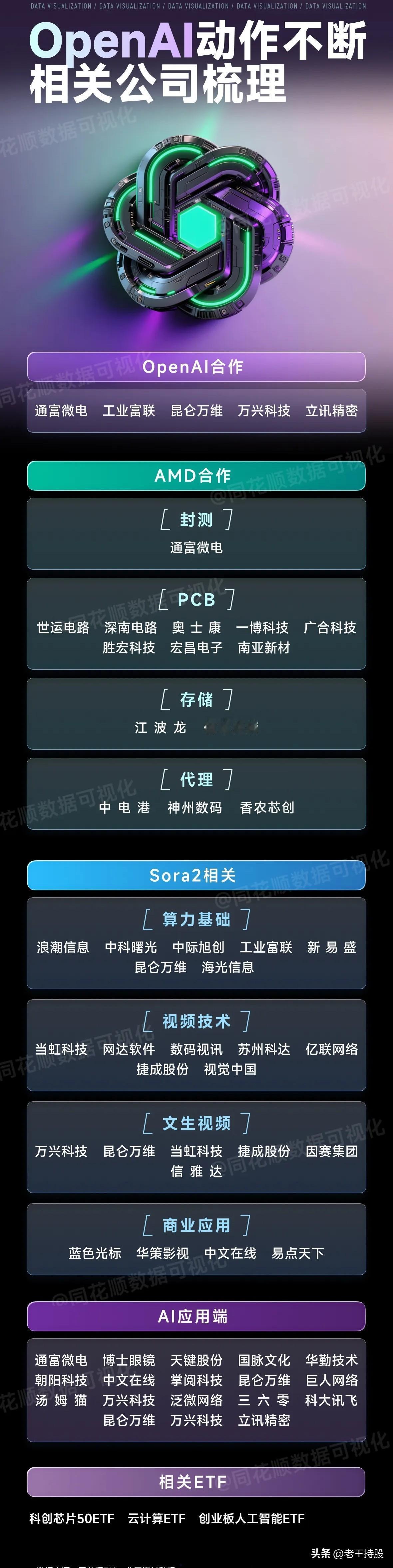 当前财经与科技领域热点信息: 一、A股市场动态:沪指突破3900点,创10年新高 关键信息: - 时间与事件: 2025年10月9日,上证指数(沪指)成功站上3900点整数关口,并创下近10年来的历史新高。 - 历史对比: - 2025年8月22日,沪指突破3800点,为10年来首次; - 2025年8月18日,突破3731点(该位置为2021年2月18日的前期高点); - 2025年8月13日,突破3674点(为2024年10月8日高点)。 - 趋势展示: 图表以“山峰”形式展现指数一路攀升,山峰高度逐个上升,红旗标注重要节点,远处还有4000点、甚至历史最高点5178点的标记,暗示市场仍有进一步上行空间。 - 数据来源: 东方财富Choice数据,制图时间为2025年10月9日。 👉 解读: A股近期表现强劲,指数连破多个重要心理与技术关口,市场情绪高涨,投资信心增强,沪指迈入一个新的历史高位区间。 二、券商10月金股出炉:阿里、腾讯、洛阳钼业成最热门推荐 关键信息: - 金股策略报告陆续发布,三大热门标的: - 阿里巴巴(推荐机构数:6家):9月涨幅高达52.98%,最新市值30228亿元,属于商贸零售行业。 - 腾讯控股(推荐机构数:6家):9月涨幅11.15%,最新市值56497亿元,属于传媒行业。 - 洛阳钼业(推荐机构数:6家):9月涨幅27.02%,最新市值3695亿元,属于有色金属行业。 - 其他热门金股包括: - 中芯国际(4家推荐,涨幅22.11%,市值11112亿元,电子)、 - 华友钴业(4家推荐,涨幅37.15%,市值1335亿元,有色金属)、 - 牧原股份(4家推荐,但9月涨幅为-3.57%,农林牧渔)、 - 立讯精密、兆易创新、科沃斯、中际旭创、海康威视、宁德时代等也获得多家券商推荐。 - 行业覆盖广泛: 包括商贸零售、传媒、有色金属、电子、农林牧渔、通信、计算机、房地产、电力设备、国防军工、社会服务等。 👉 解读: 券商普遍看好科技(如阿里、腾讯、中芯国际)、资源(洛阳钼业、华友钴业)、消费及高端制造方向,认为这些板块在10月具备较高的投资价值与增长潜力。 三、OpenAI持续布局,相关产业链公司全面梳理 关键信息: - 主题: OpenAI近期动作频频,相关合作及产业链上下游企业受到市场高度关注。 - 分类梳理如下: 1. OpenAI合作公司 - 包括:通富微电、工业富联、昆仑万维、万兴科技、立讯精密等。 2. AMD合作公司(多细分领域) - 封测: 通富微电 - PCB(印刷电路板): 世运电路、深南电路、奥士康、一博科技、广合科技、胜宏科技、宏昌电子、南亚新材 - 存储: 江波龙、佰维存储 - 代理: 中电港、神州数码、香农芯创 3. Sora2相关公司(围绕视频生成与AI内容) - 算力基础: 浪潮信息、中科曙光、中际旭创、工业富联、新易盛、昆仑万维、海光信息 - 视频技术: 当虹科技、网达软件、数码视讯、苏州科达、亿联网络、捷成股份、视觉中国 - 文生视频: 万兴科技、昆仑万维、当虹科技、捷成股份、因赛集团、信雅达 - 商业应用: 蓝色光标、华策影视、中文在线、易点天下 4. AI应用端公司(广泛应用场景) - 包括:通富微电、博士眼镜、天键股份、国脉文化、华勤技术、朝阳科技、中文在线、掌阅科技、昆仑万维、巨人网络、汤姆猫、万兴科技、泛微网络、三六零、科大讯飞、立讯精密等。 - 其中昆仑万维、万兴科技、中文在线、通富微电、立讯精密等多次出现,显示其跨领域重要性。 5. 相关ETF(投资工具) - 科创芯片50ETF、云计算ETF、创业板人工智能ETF 👉 解读: 随着OpenAI在AI生成内容(如Sora2)、算力基础设施、多模态应用等方向的持续推进,全球AI产业链(包括芯片、算力、存储、视频技术、应用层)都迎来新一轮发展机遇。国内相关上市公司或合作方有望受益于这一全球技术浪潮,特别是在AI应用落地与算力支持方面。