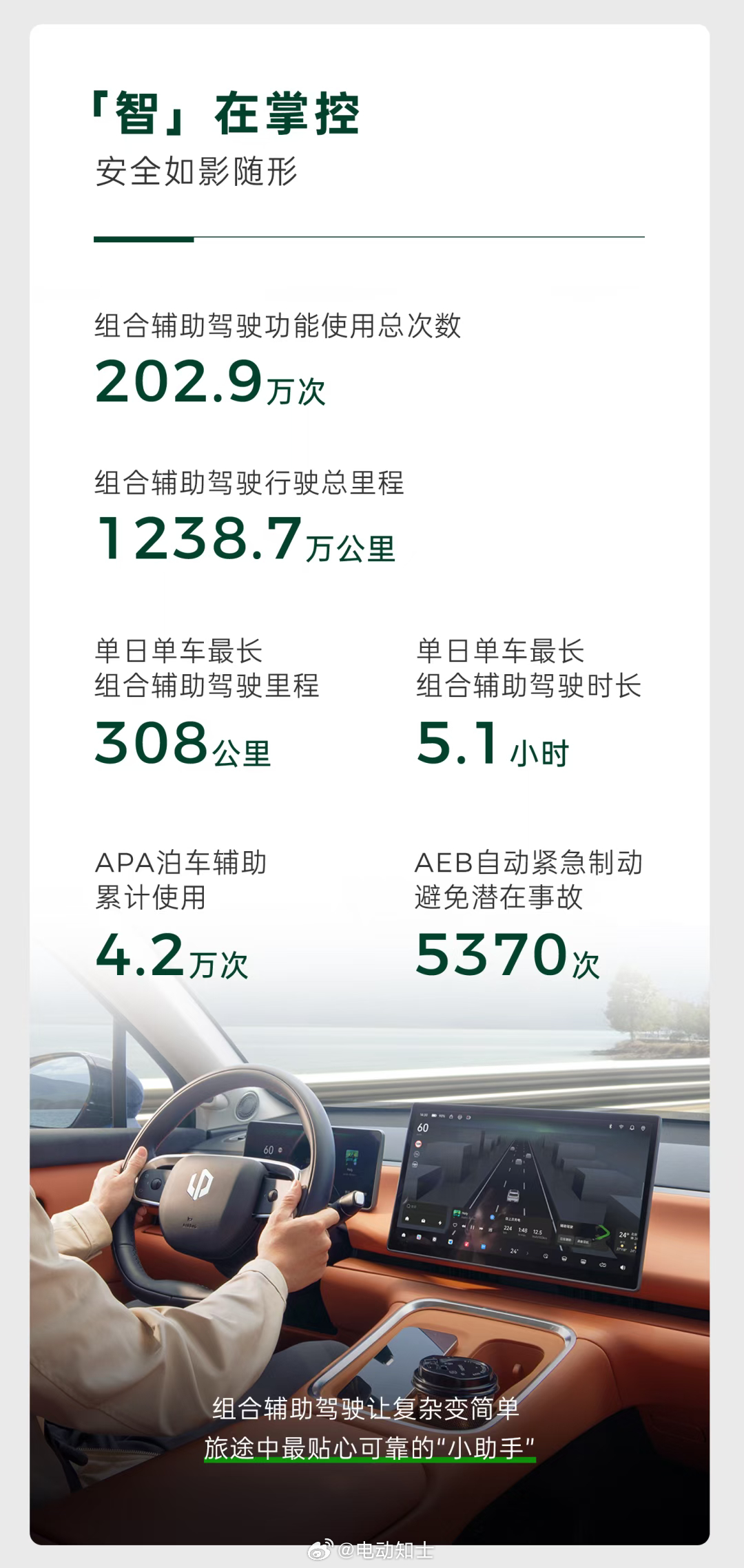 组合辅助驾驶功能使用总次数202.9万次,总里程1238.7万公里,APA泊车辅助累计使用4.2万次;