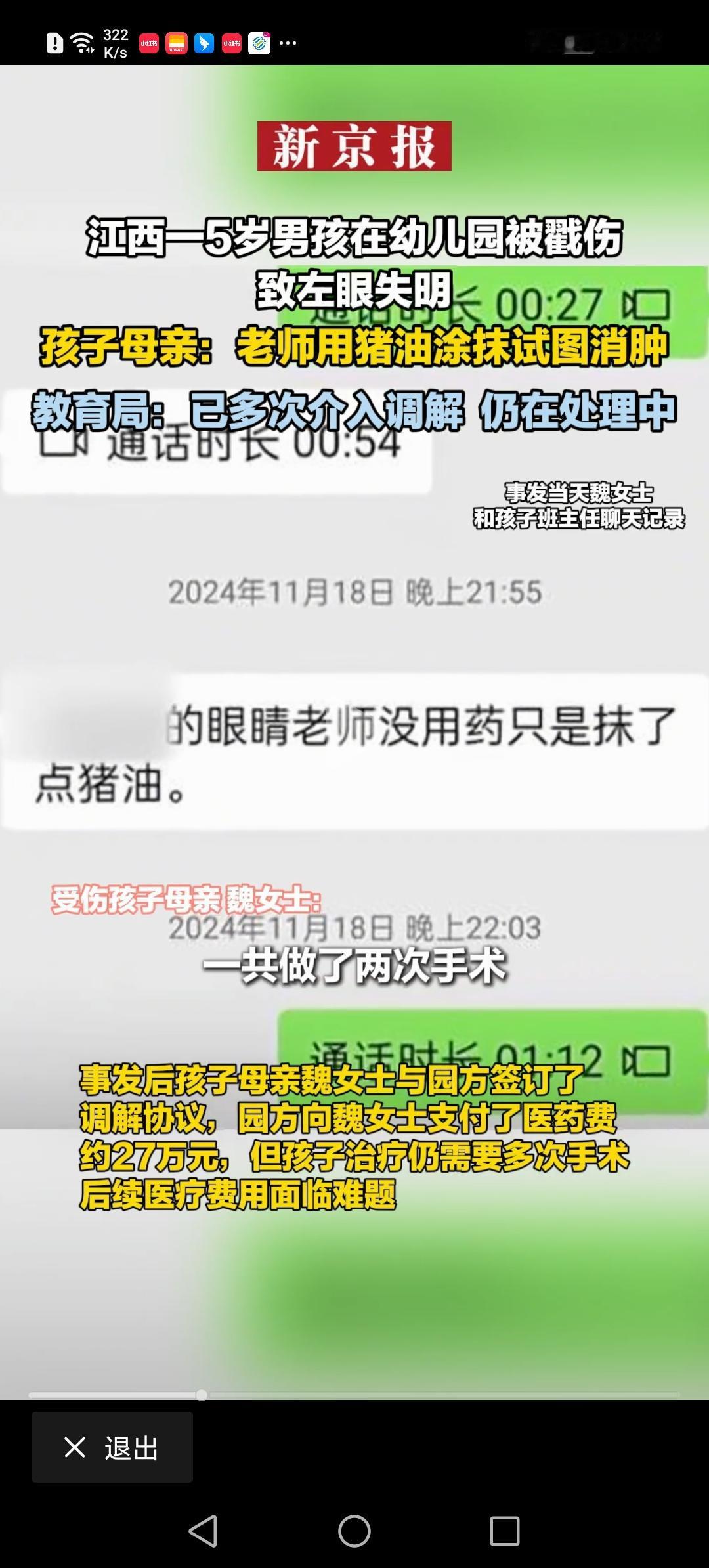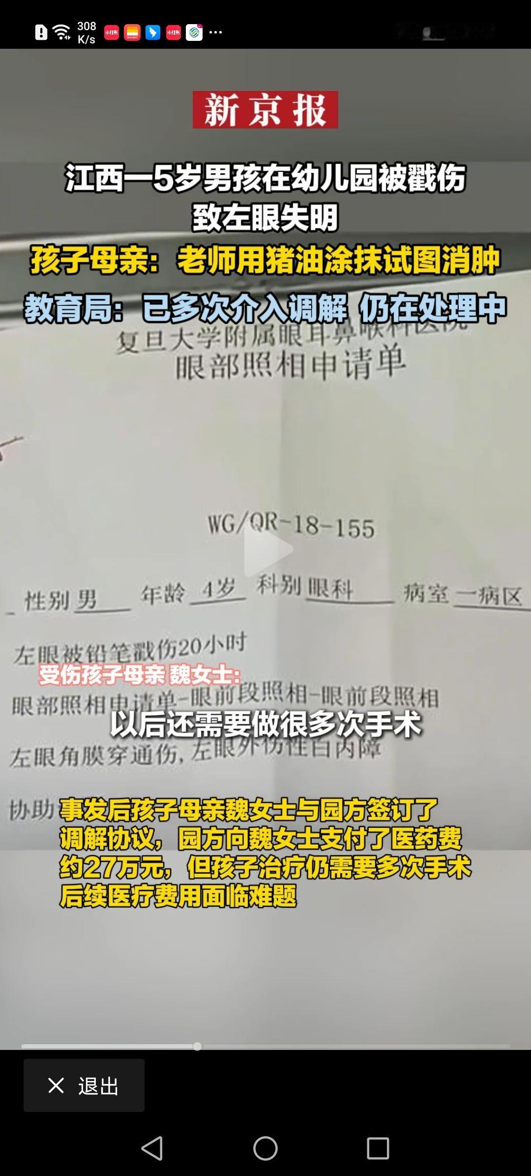 5岁娃左眼被戳瞎, 老师竟抹猪油“救场”?江西家长怒了! “孩子哭着回来,我以为是磕碰,直到看见眼球里那道白痕。”江西赣州一位妈妈发帖,5岁儿子在幼儿园被硬物戳穿角膜,老师没打120,先拿厨房猪油给涂伤口,说是“土办法止血”。三天后,医院宣判:左眼失明,角膜穿孔+化脓性眼内炎。 猪油不是抗生素,是细菌培养基!眼科医生直摇头:黄金抢救6小时被耽误,病菌顺着油脂往眼窝里钻,再晚一点连右眼都保不住。 涉事园方至今没给书面说明,只在家长群回复“孩子打闹难免”。打闹?监控里分明是手工剪刀尖朝下坠落。家长报警、教育局介入,园方连夜把“猪油止血”聊天记录删了个干净,可惜互联网有记忆。 别等出事了才查资质。给娃选幼儿园,先看有没有保健医生、急救药箱里有没有红霉素眼膏,而不是一桶炒菜油。眼睛只有一对,赔不起。 你家娃在学校受过伤吗?评论区聊聊,一起给幼儿园划条安全红线!