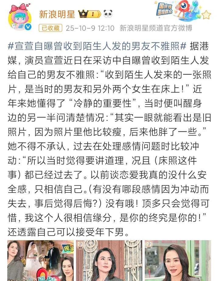 宣萱曾经发现男友和另外两个女生一起躺在床上,但是她没有发脾气,而是很冷静的把男朋友喊醒,因为她发现的是照片,而且她隐隐觉得照片的拍摄时间是在两人交往之前,确认之后她就冷静了下来,风波就此平息。 “不管是不是过去的照片,一个男的跟两个女的躺床上是啥好人”、“人不好,但身体好”、“一男二女还觉得没问题?”、“古天乐不考虑一下吗”、“老了,就只能选择冷静,就只能一眼看出是旧照片,她明明是害怕失去”……,网友们的看法五花八门。 宣萱的处理方式足够冷静,这给所有处于情感问题的男女来说是个好榜样,如何看待另一半的过去,这是一门学问,我不敢妄言该如何做,但我知道,不能让历史遗留问题成为我们向前发展的阻碍,只有抛下负担,才能更好的奔向未来。