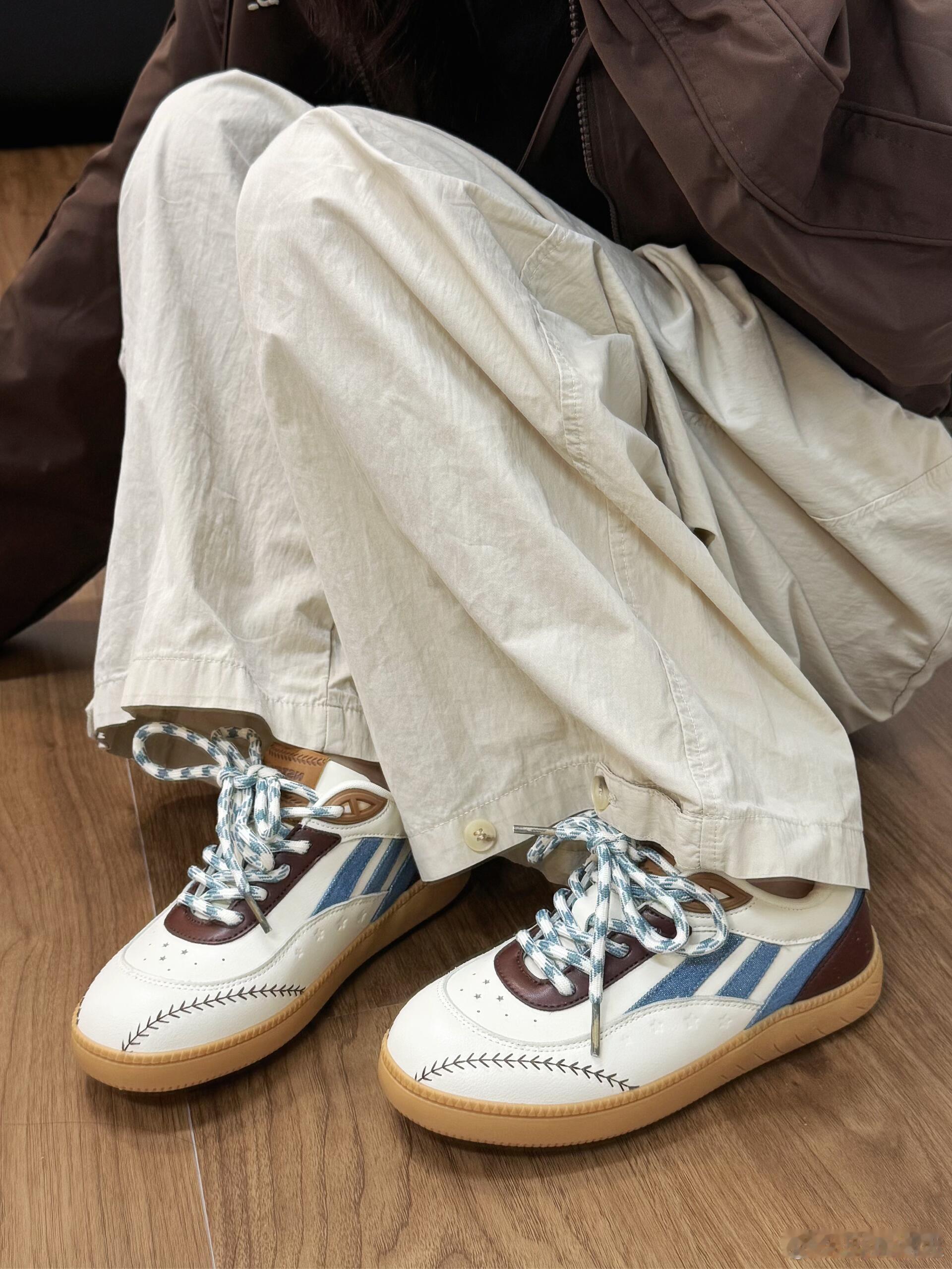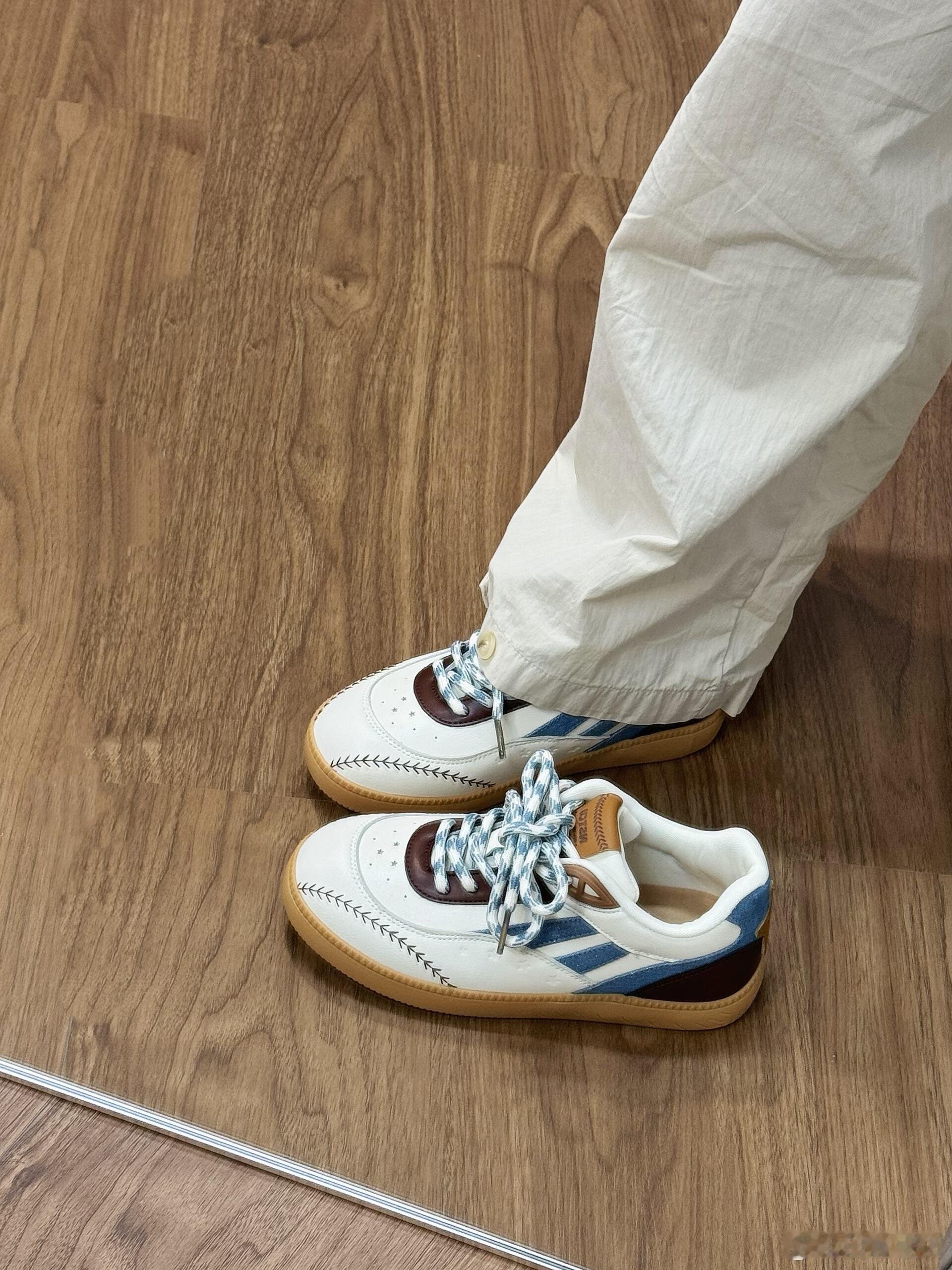 这双鞋巧妙融合了复古基因与现代审美,米白色小牛皮鞋面奠定了简约清爽的基调,而深蓝色条纹与酒红色皮革补丁的撞色设计则成为视觉焦点,赋予其独特的个性与活力。蓝白相间的编织蜡绳鞋带、鞋头与后跟的精致刺绣细节,以及呼应鞋舌标签的棕色橡胶外底,无不体现对工艺的考究。