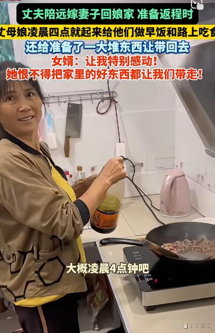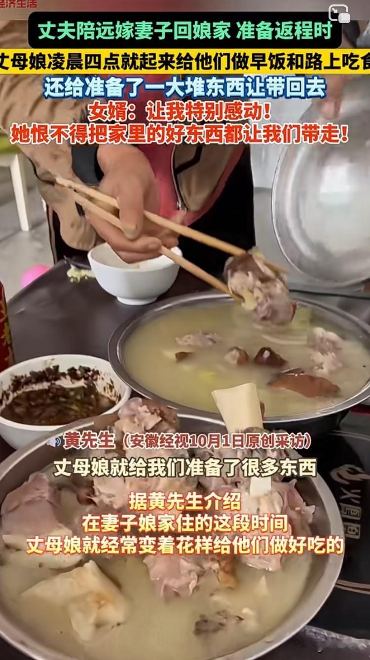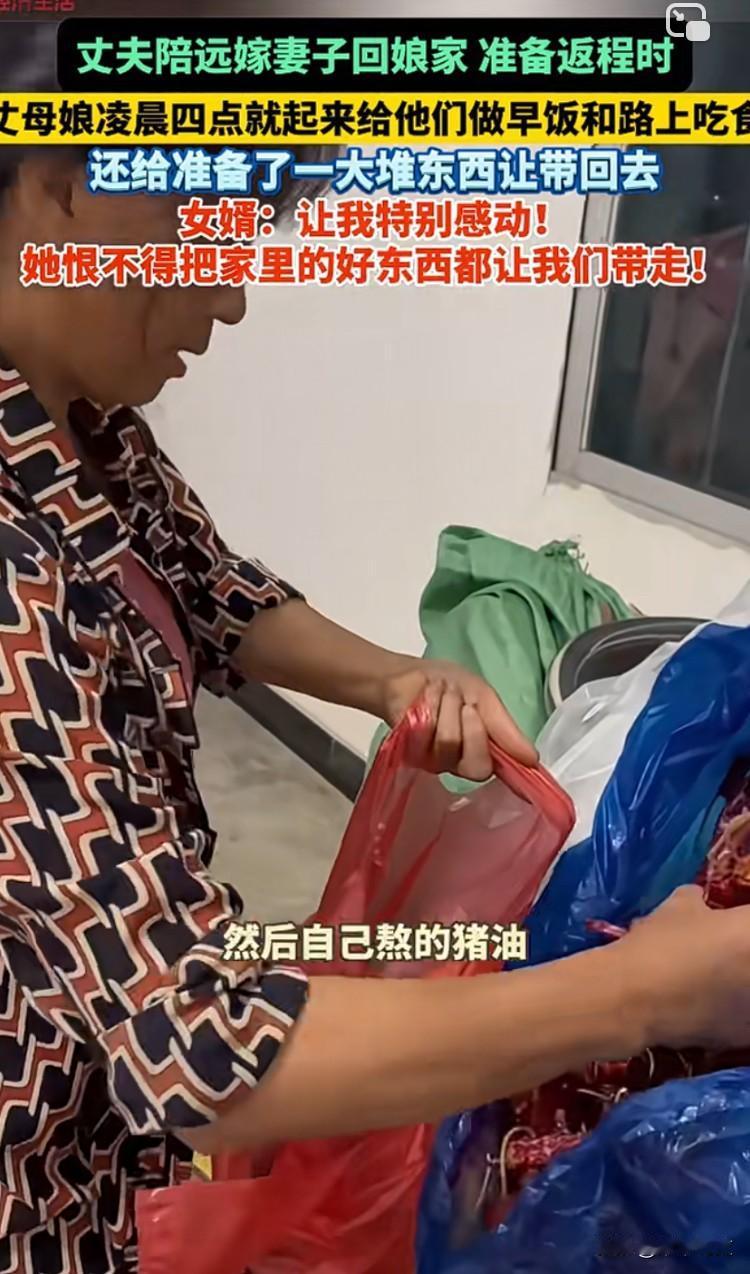 没有丈母娘不疼姑爷的,只有婆婆不疼儿媳。 姑爷是湖北人,趁着国庆假期带着孩子老婆回到贵州娘家住几天。 返程的那天,丈母娘凌晨四点就起床准备早饭给姑爷和女儿吃。 像家里种的小黄姜、地瓜、辣椒、熬的猪油、自家杀的土猪肉。 只要是觉得好的东西,通通都打包让姑爷和女儿带走。 送别的时候丈母娘哭得泪眼汪汪。姑爷也特别不舍,觉得特别感人,于是将记录下来的视频发布在网上,表达对丈母娘的感谢。 网友看了泪眼婆娑,“我妈妈就是这种人,真恨不得都给你。可婆婆就完全相反,过年回去要吃没吃,要住没住的,哎,说多了都是眼泪。” “丈母娘对女婿那都是真心实意的,不求回报的那种,但没几个婆婆对儿媳会这样。” “丈母娘对女婿恨不得把家里所有东西都给他们,好吃好喝的伺候,只是想让他们对自己女儿好点!” 网友表示已经深深的共情了!