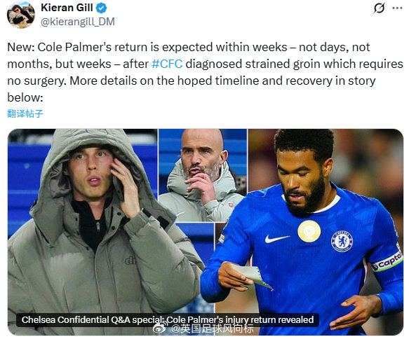 【帕尔默11月才能复出】《每日邮报》Kieran Gill独家消息:正在养伤的切尔西中场核心帕尔默,基于腹股沟伤势问题,球队内部会议之后,确定其将要继续养伤数周时间,预计要等到11月份才能复出。